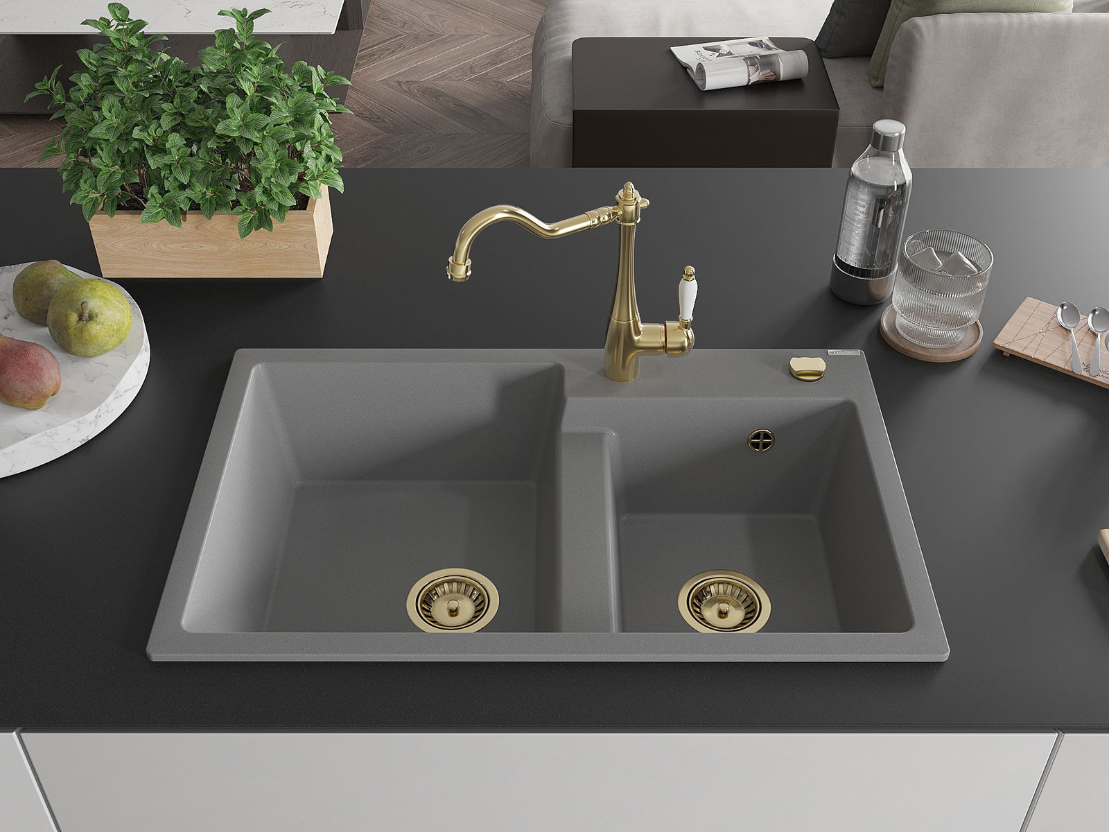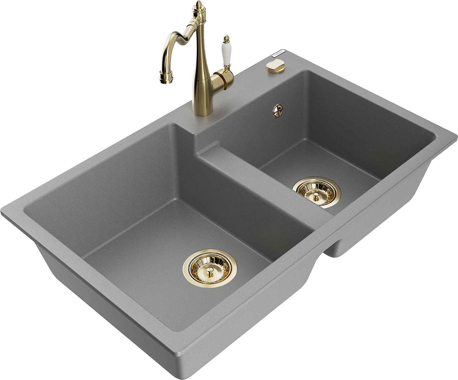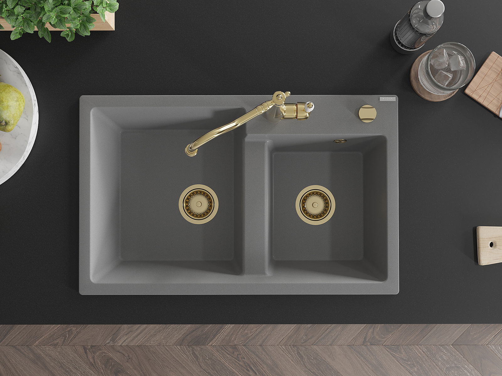 Mexen Tomas гранитна кухненска мивка с 2 корита с кухненски смесител Carla, сив - 6516-71-670700-50