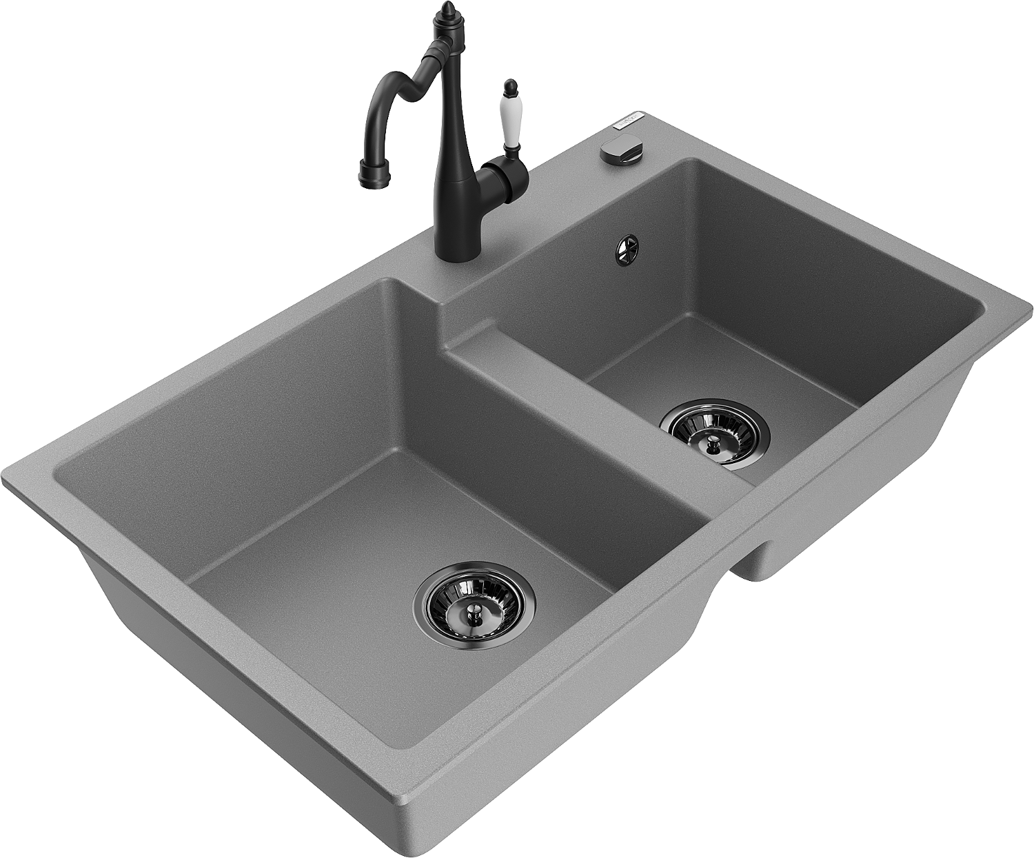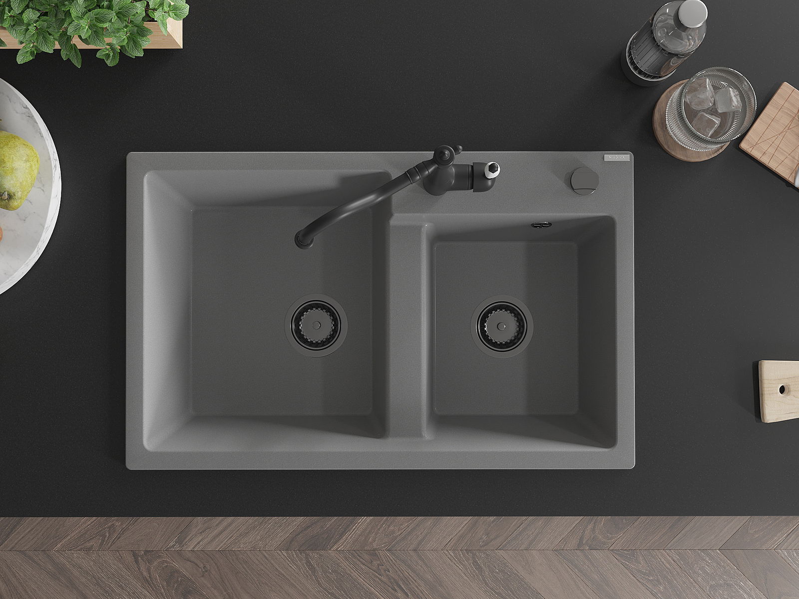 Mexen Tomas гранитна мивка с 2 камери и кухненски смесител Carla, сив - 6516-71-670700-70-B