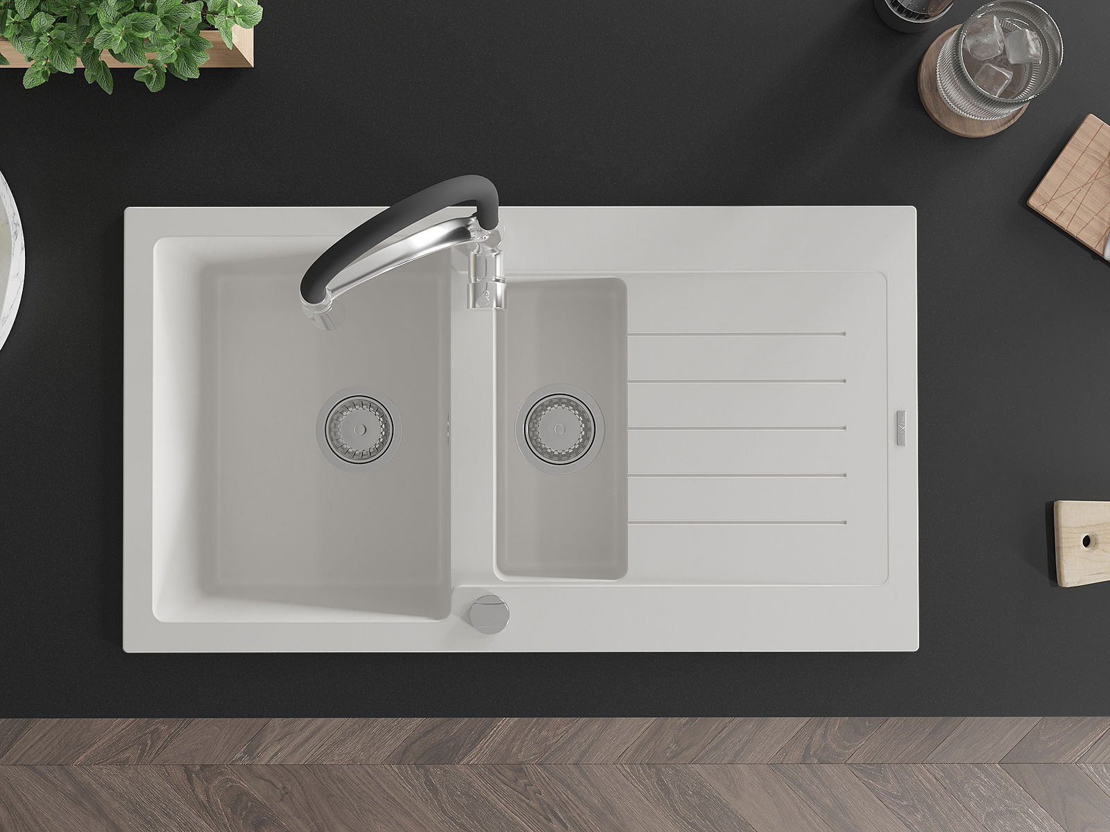 Mexen Matias гранитна мивка 1,5 камера с отцедник и кухненски смесител Aster, бял - 6502-20-73450-07