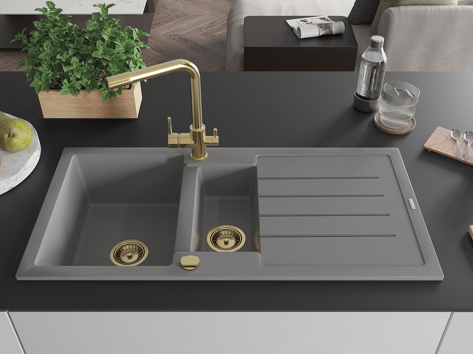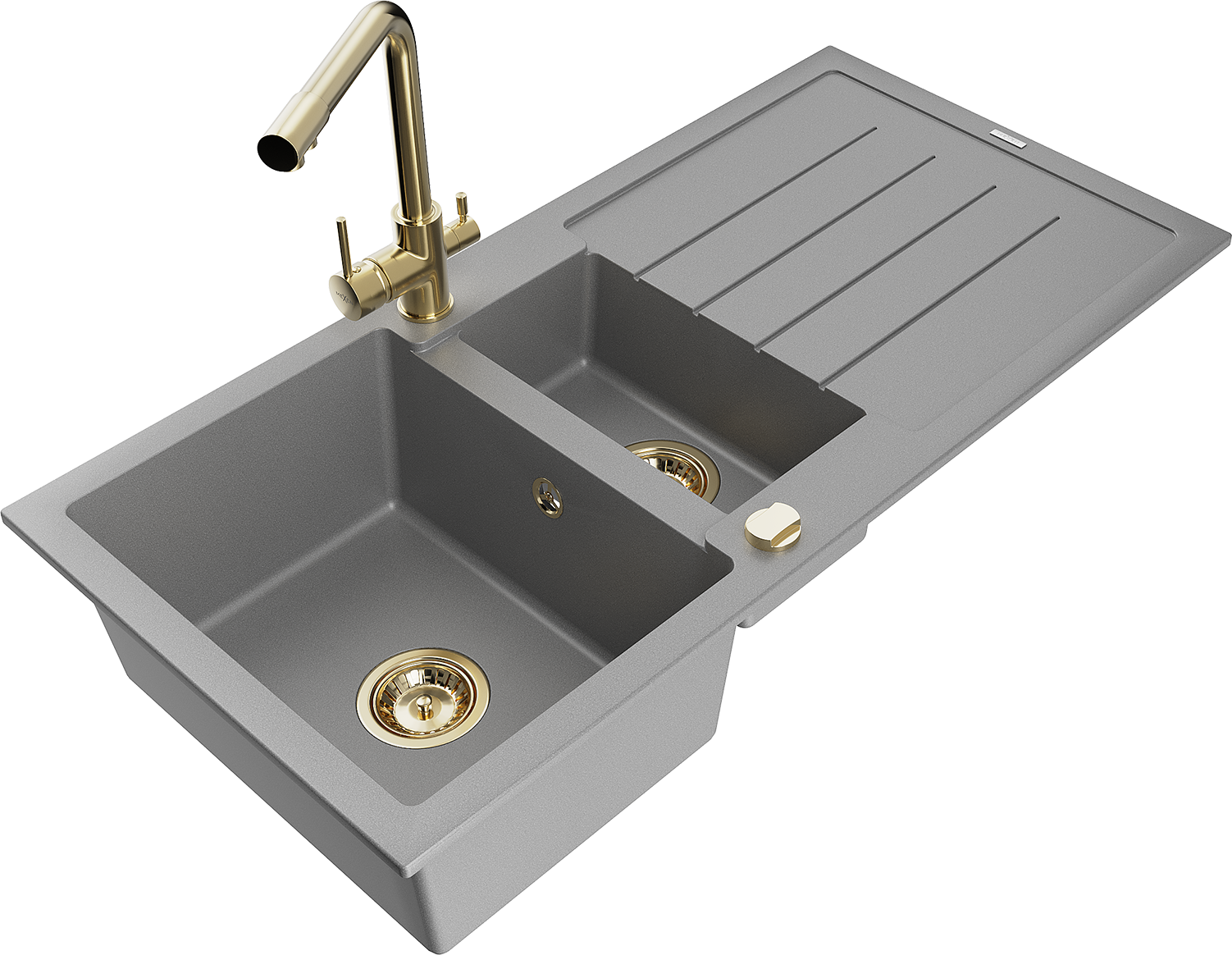 Mexen Andres гранитна мивка 1,5-камерна с отцеждач и кухненски смесител Duero, сив - 6515-71-671600-50