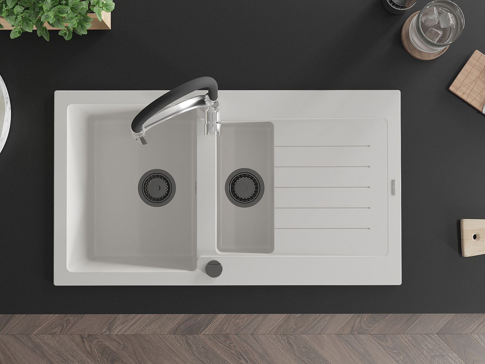 Mexen Matias гранитна мивка 1,5 камерен с отцедник и кухненски смесител Aster, бял - 6502-20-73450-07-B