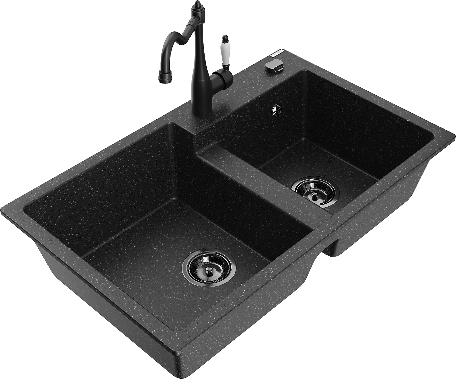 Mexen Tomas гранитна кухненска мивка с 2 отделения и кухненски смесител Carla, черен/сребърен металик - 6516-73-670700-70-B