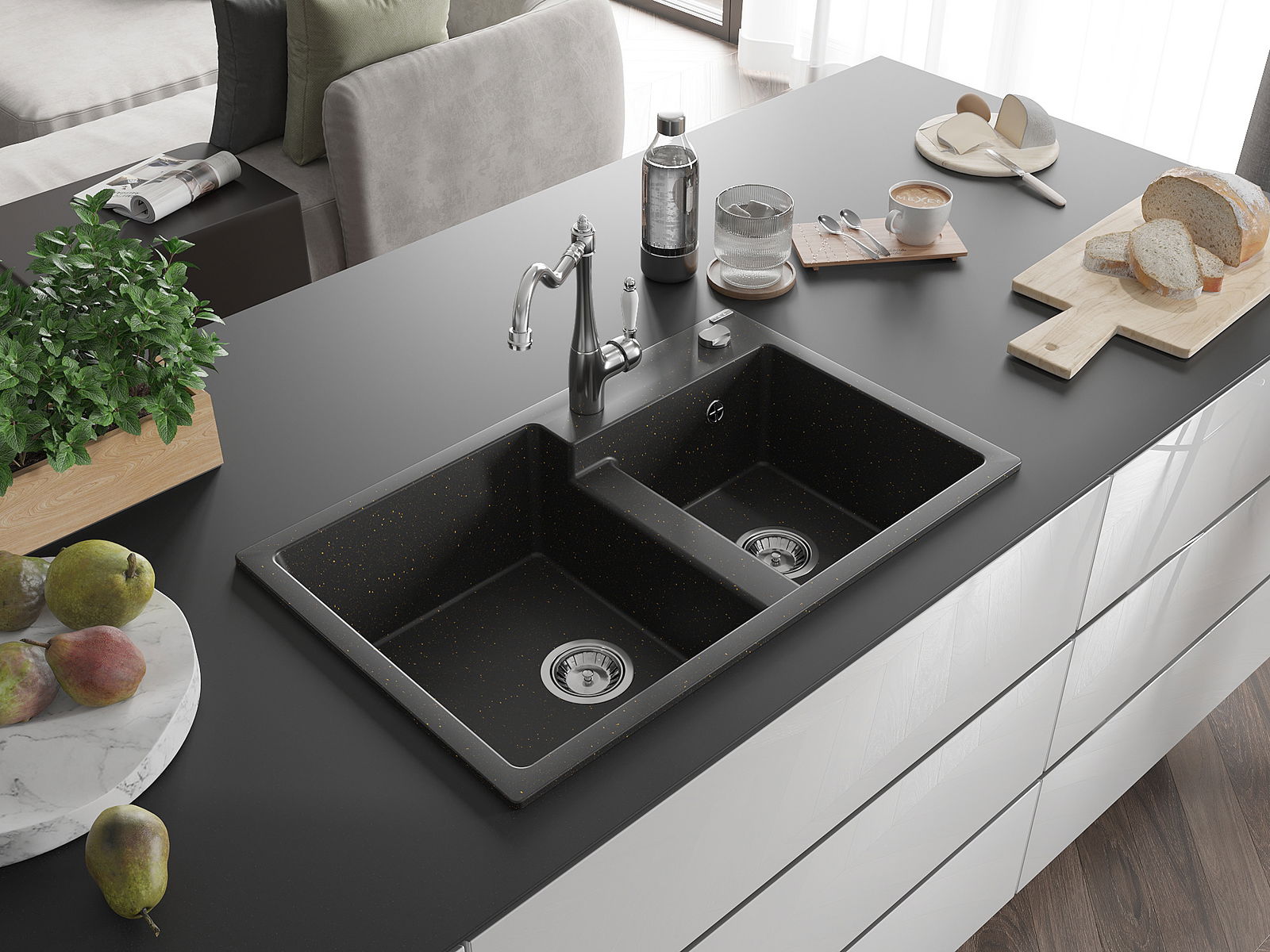Мивката е направена от висококачествен гранит. Това е елегантно и най -вече практично допълнение към всяка кухня, независимо от нейния стил. Висококачествената и гранитна издръжливост осигуряват много години употреба.