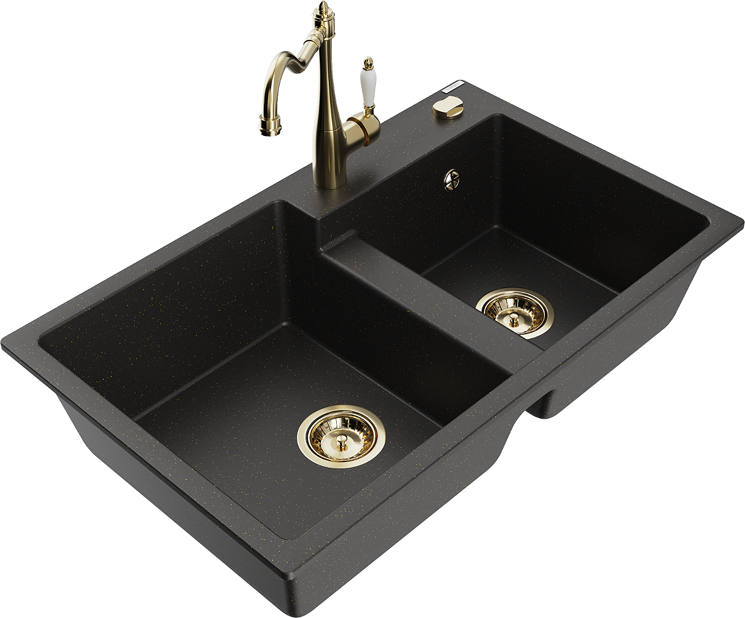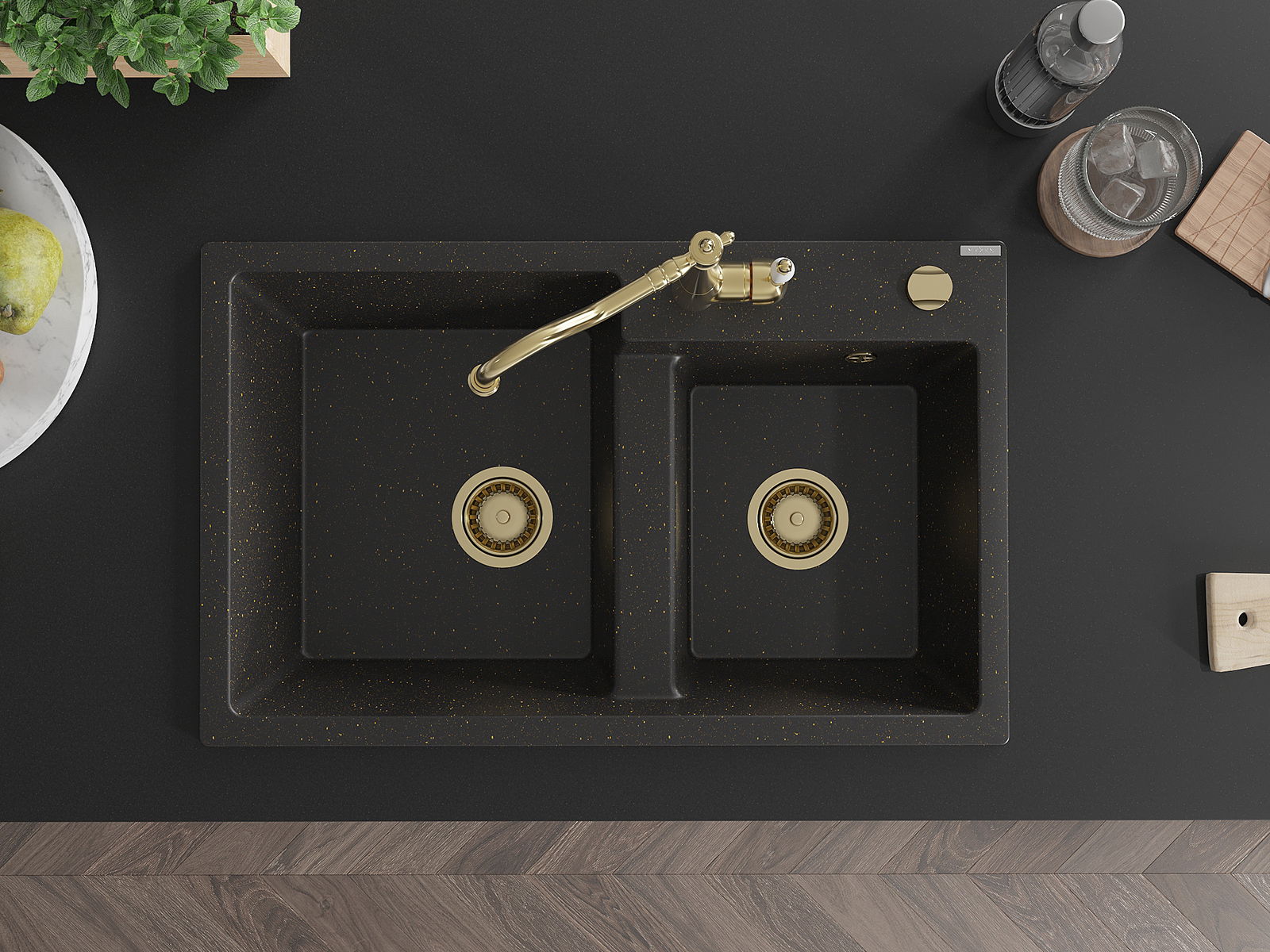 Mexen Tomas двоен гранитен мивка с кухненски смесител Carla, черен/златен металик - 6516-75-670700-50