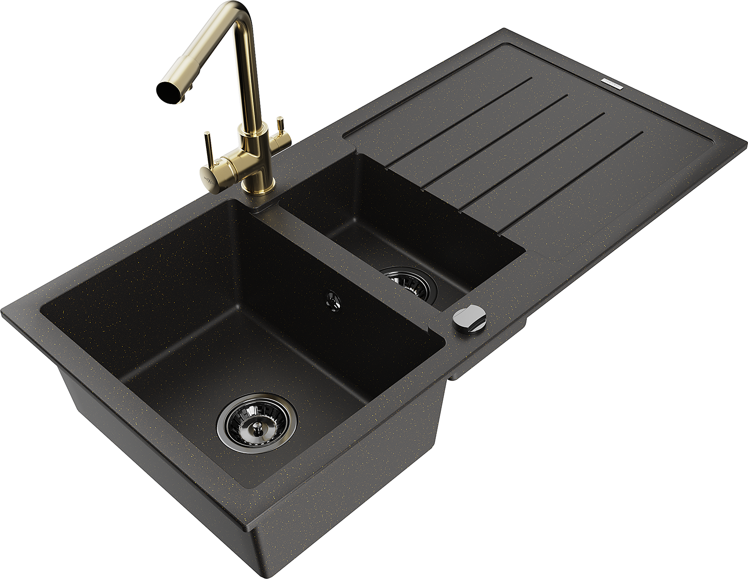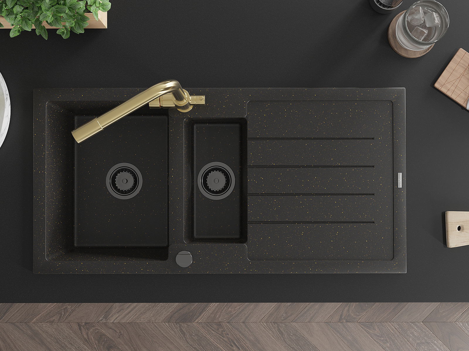 Mexen Andres гранитна мивка 1,5-коморова със сушилня и кухненски смесител Duero, черен/златен - 6515-75-671600-50-B