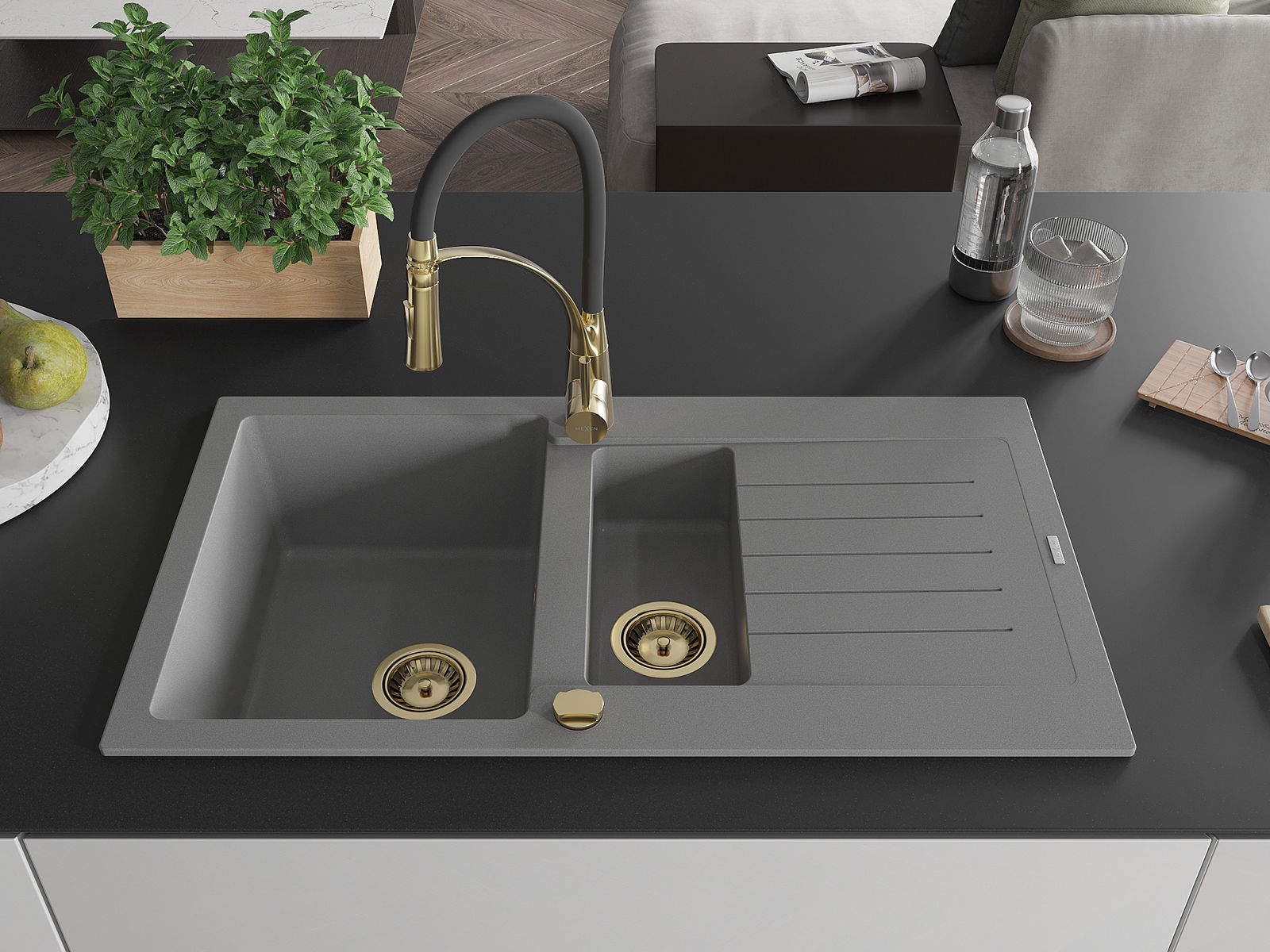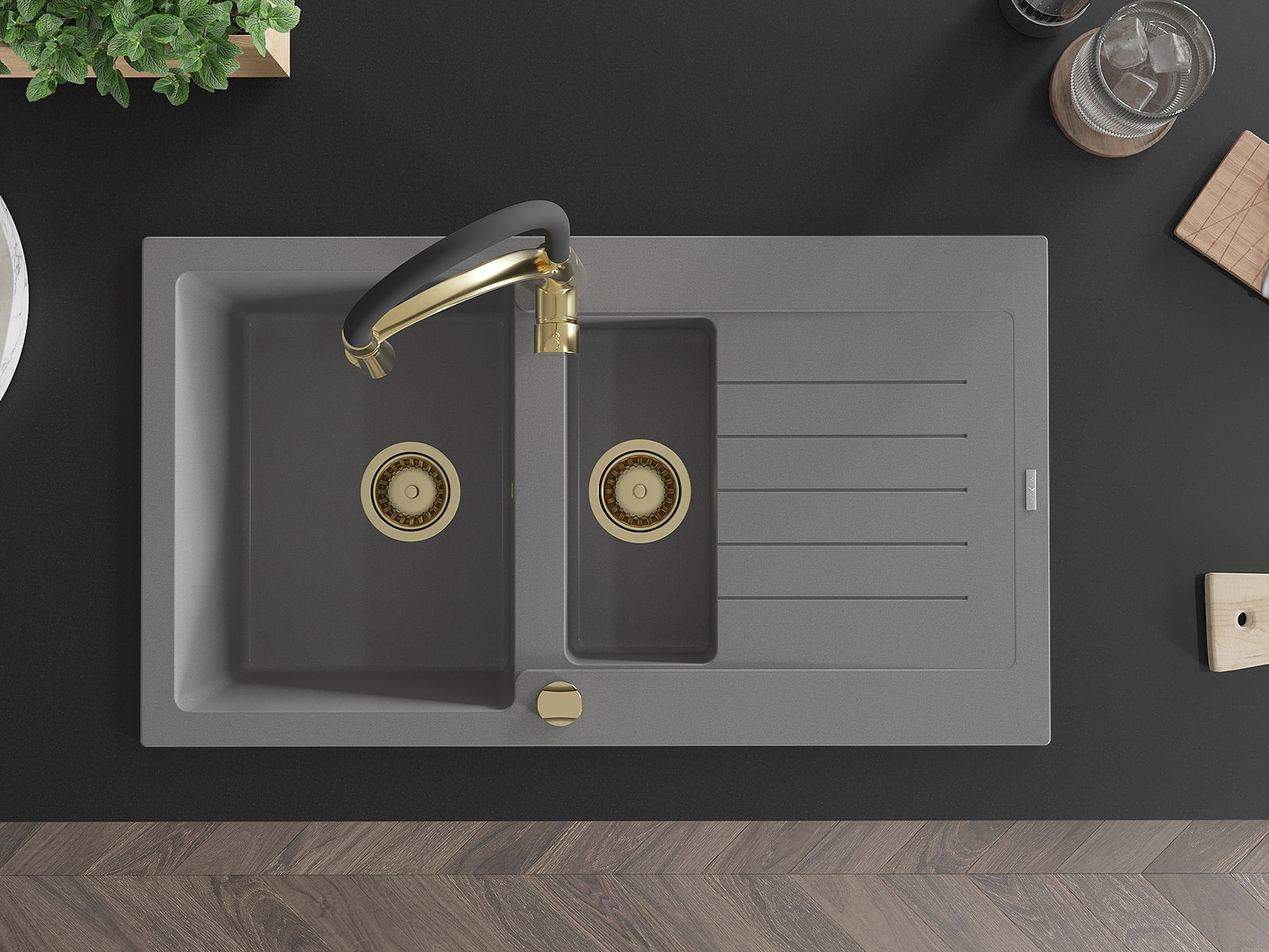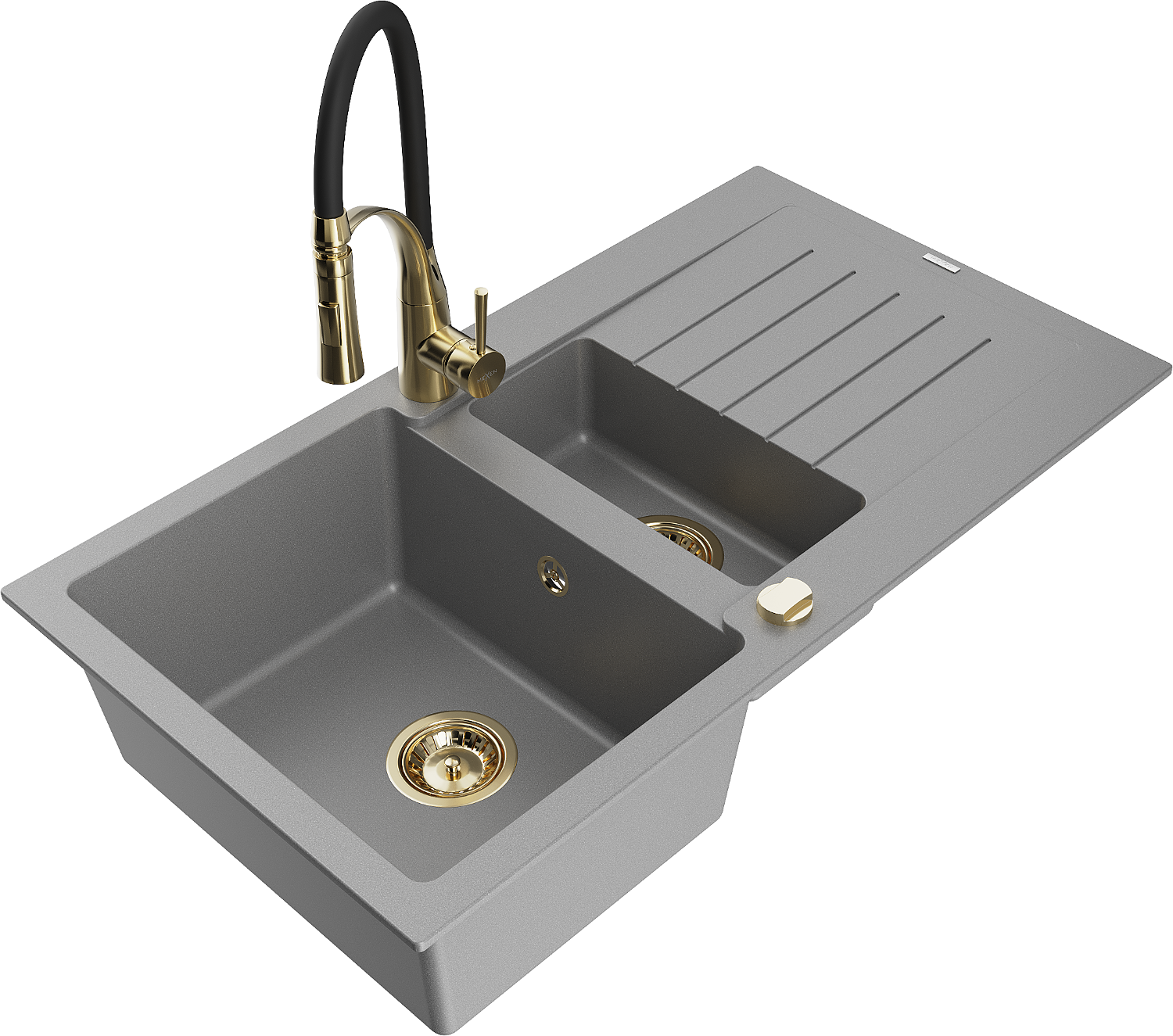 Mexen Matias гранитна мивка с 1,5 камери, отцедник и кухненски смесител Aster, сив - 6502-71-73450-57-G