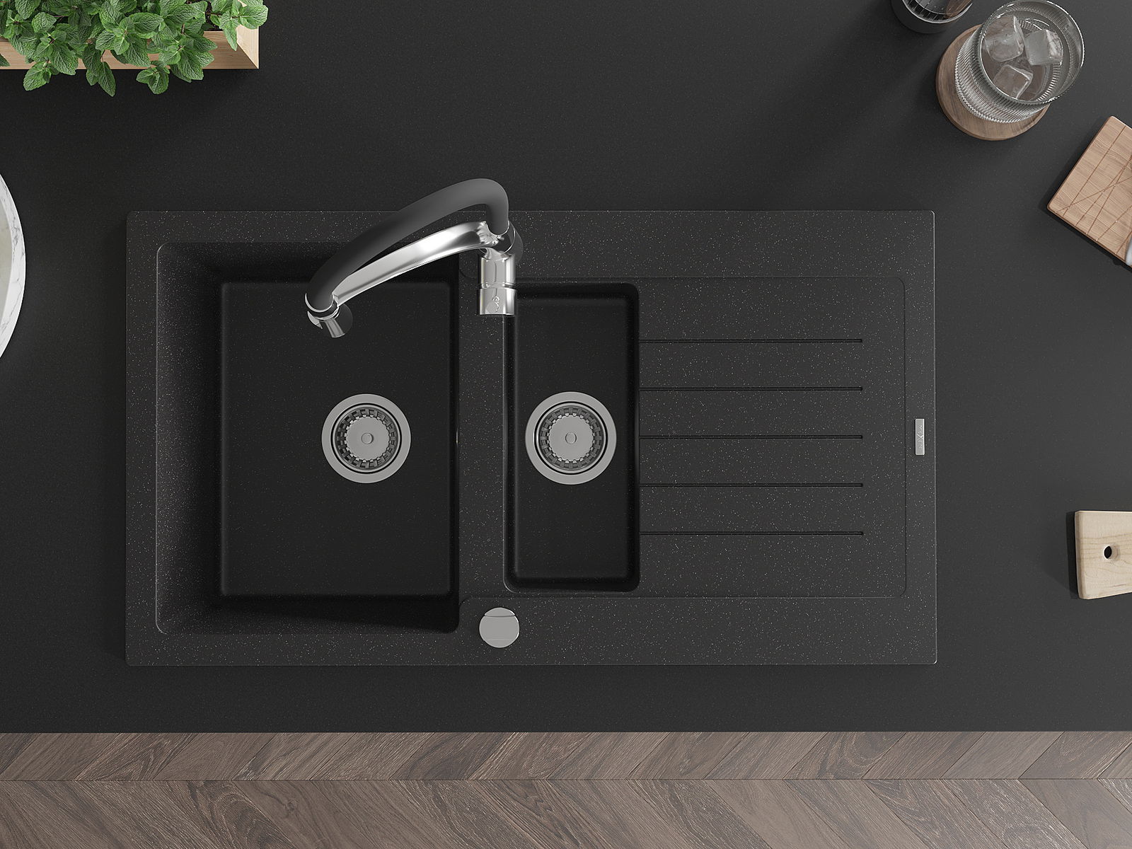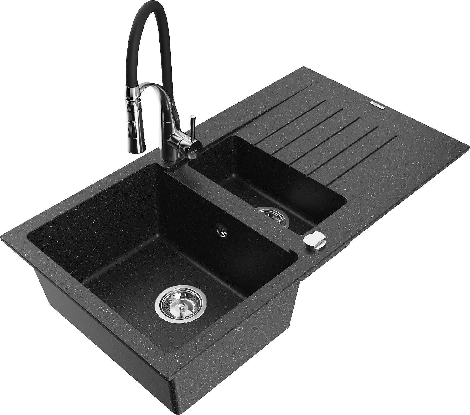 Mexen Matias гранитна мивка 1,5-камерна с капак и кухненски смесител Aster, черен/сребрист металик - 6502-73-73450-07
