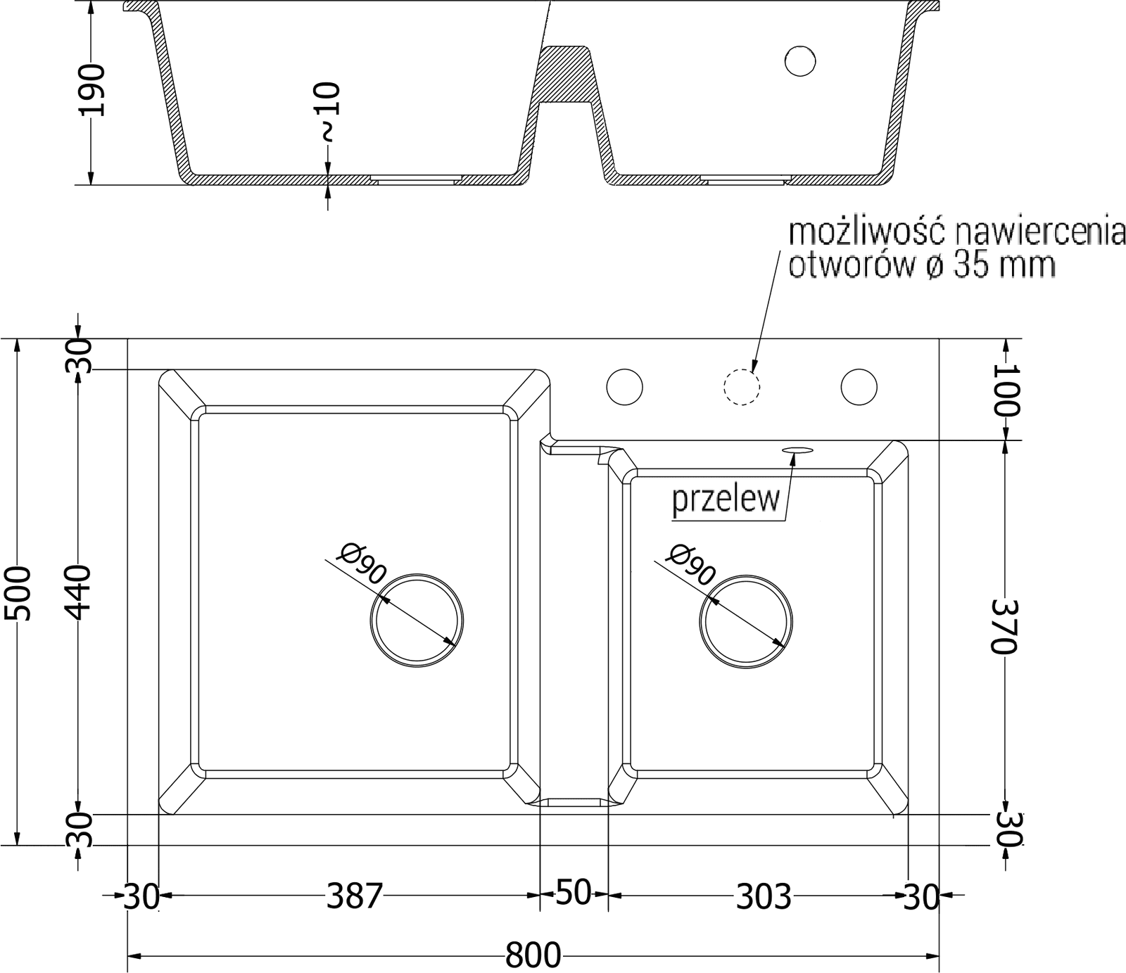 Мивката разполага с предварително издълбан отвор с диаметър 35 мм за самостоятелно изключване. Може да се използва, наред с други неща, за монтаж на дозатор за течност, който ще елиминира наличието на пластмасови бутилки в кухнята и ще й придаде елегантно завършване.