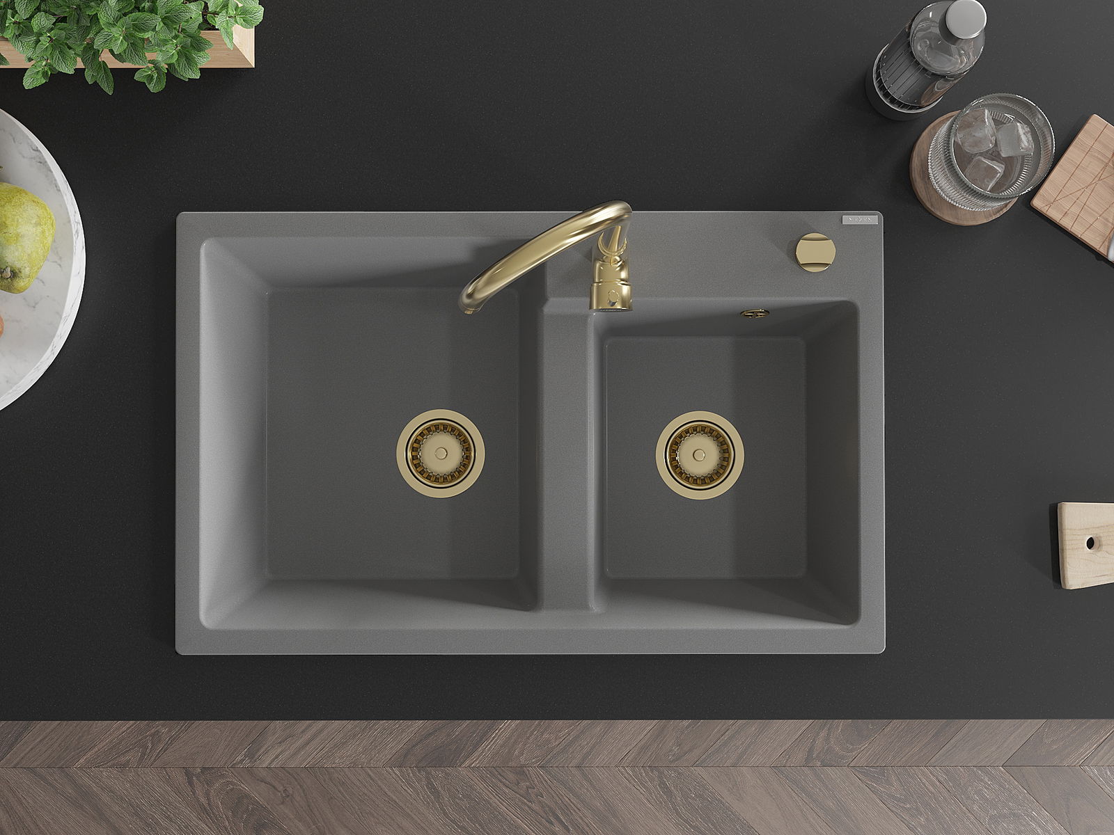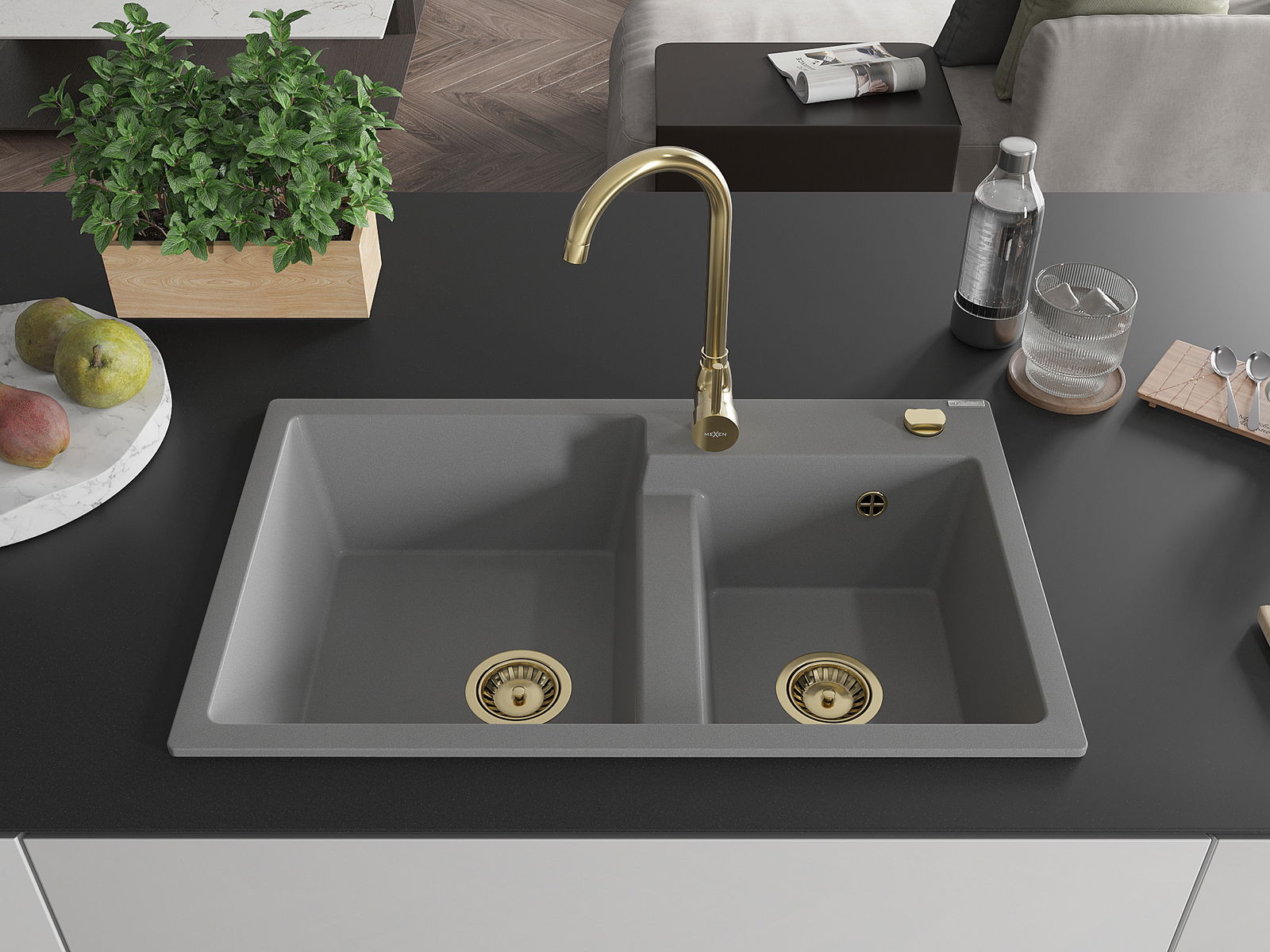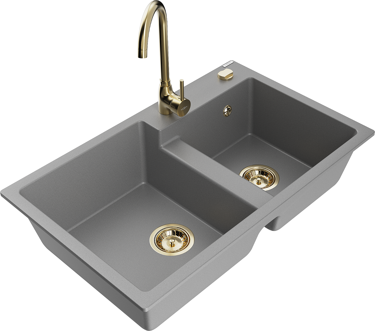 Mexen Tomas гранитна мивка с 2 корита и кухненски смесител Telma, сив - 6516-71-670200-50