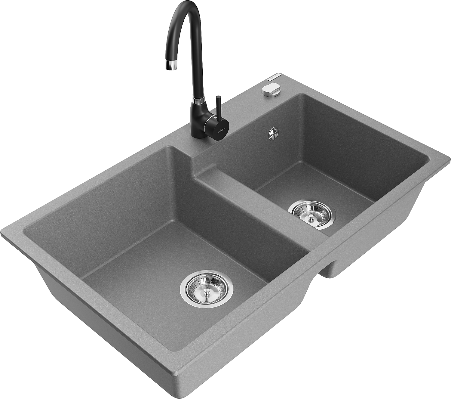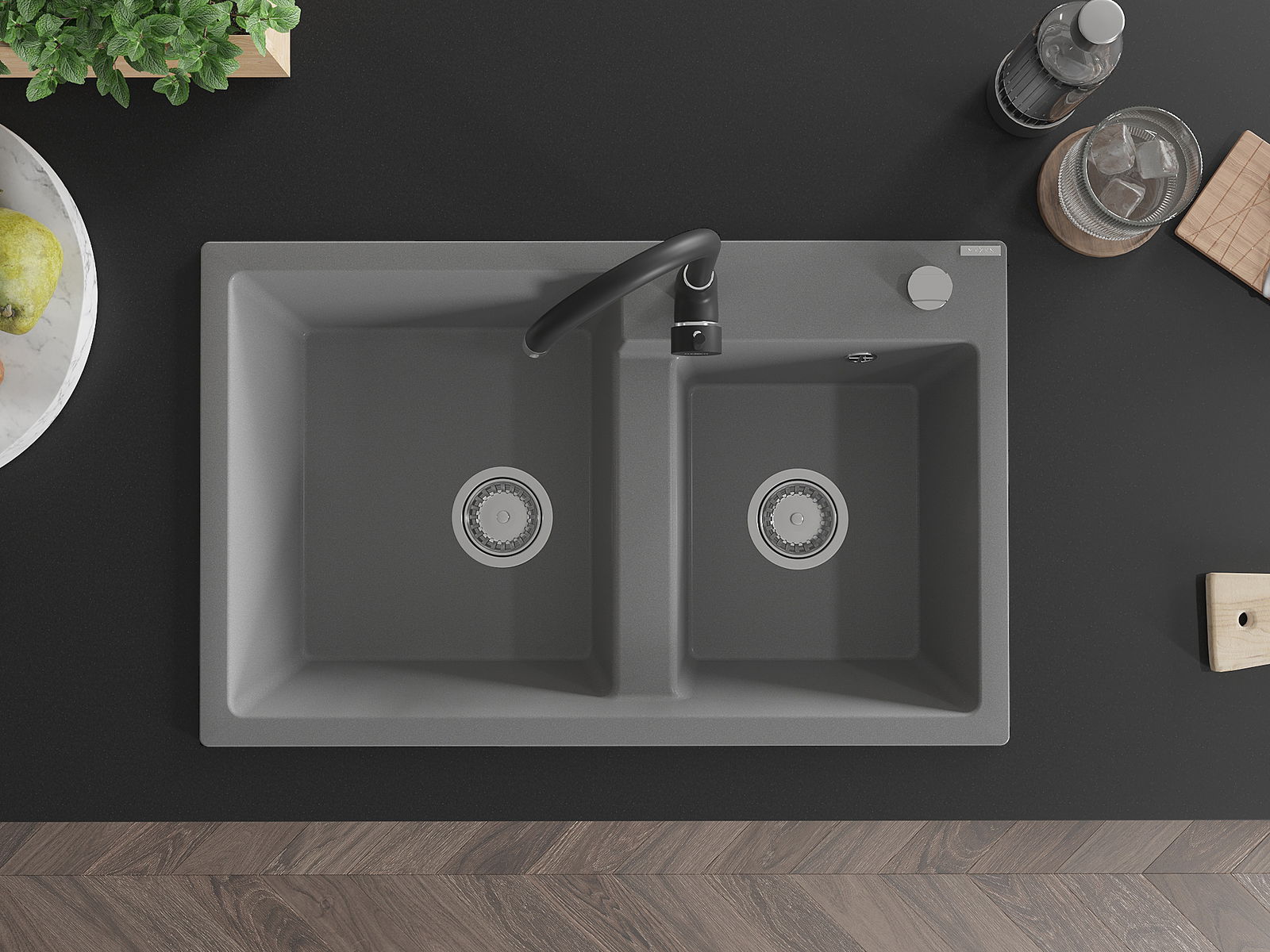 Mexen Tomas двоен гранитен кухненски мивка с кухненски смесител Telma, сив - 6516-71-670200-70