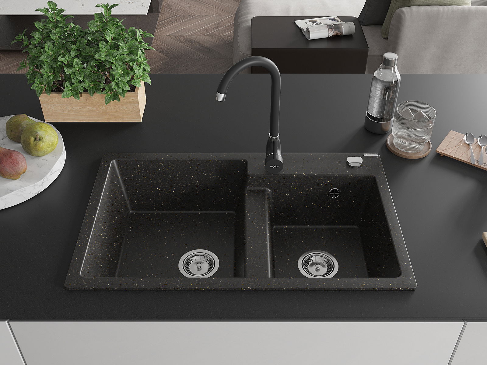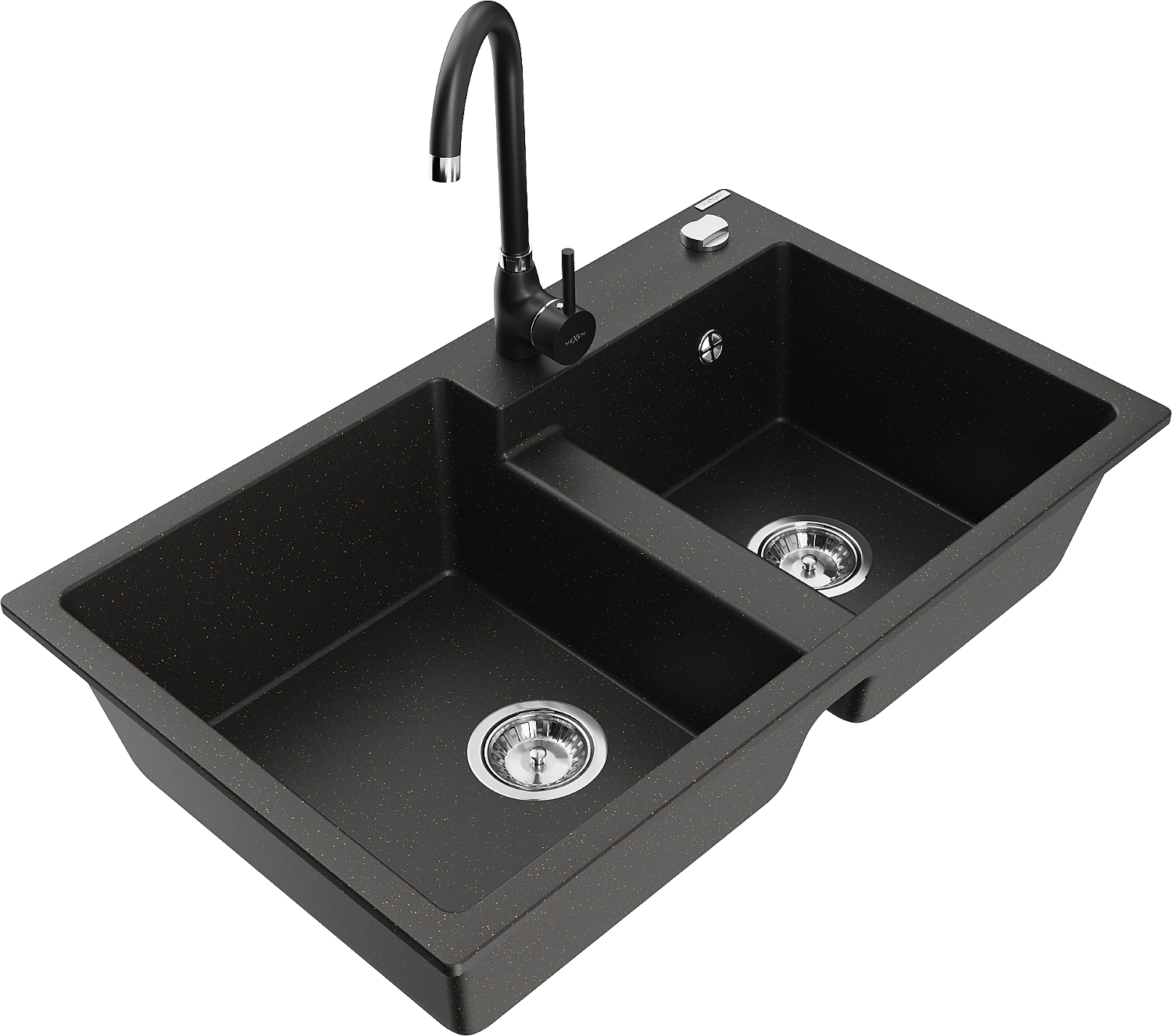 Mexen Tomas гранитна мивка с 2 отделения и кухненски смесител Telma, черно/златен металик - 6516-75-670200-70
