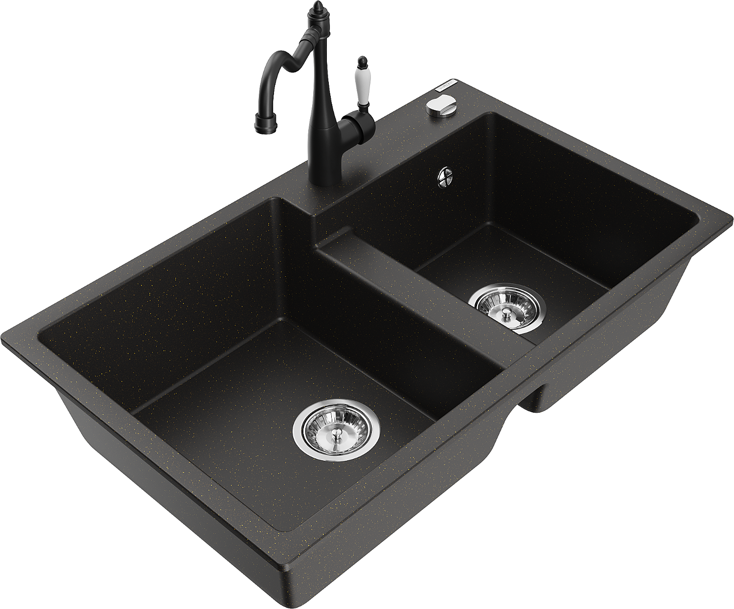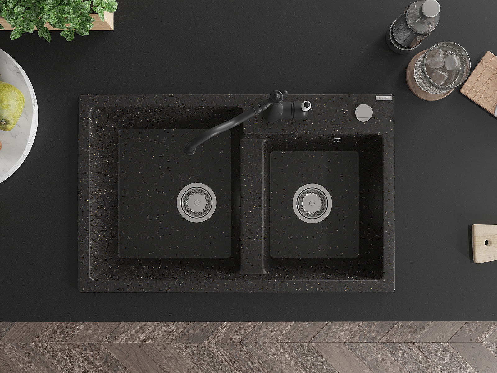Mexen Tomas кухненска мивка от гранит с 2 отделения с кухненски смесител Carla, черен/златист металик - 6516-75-670700-70