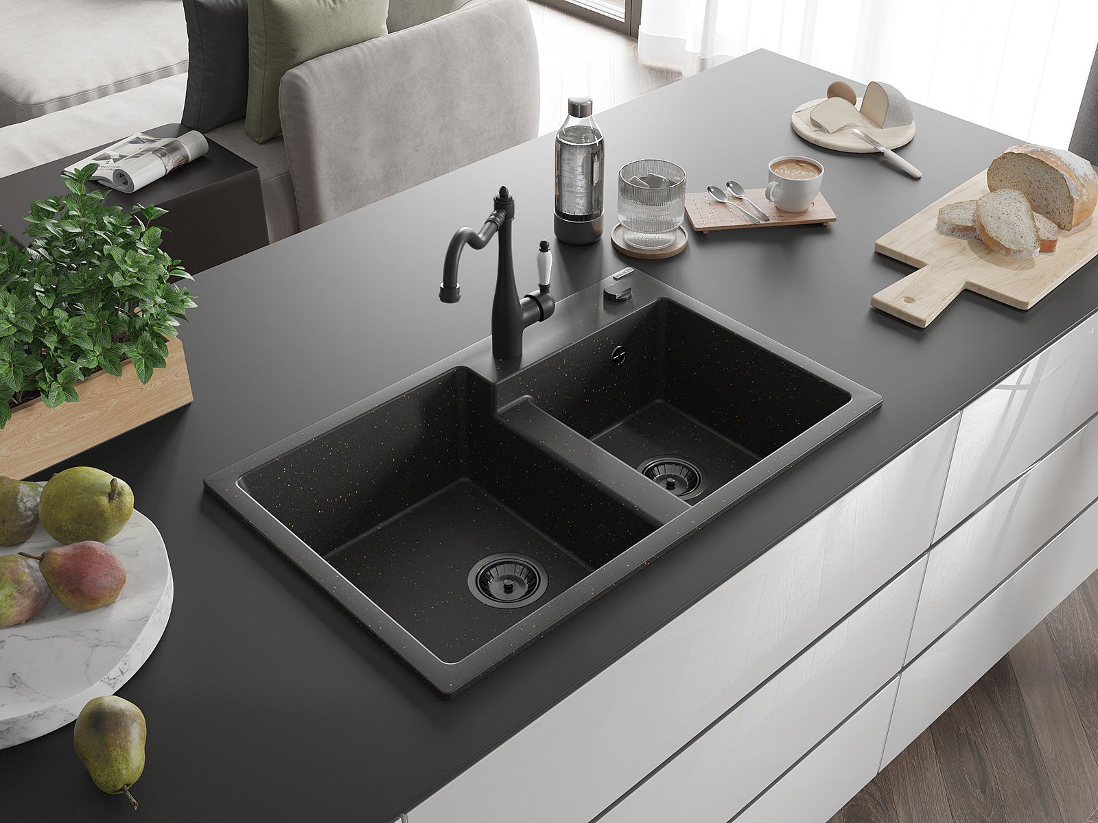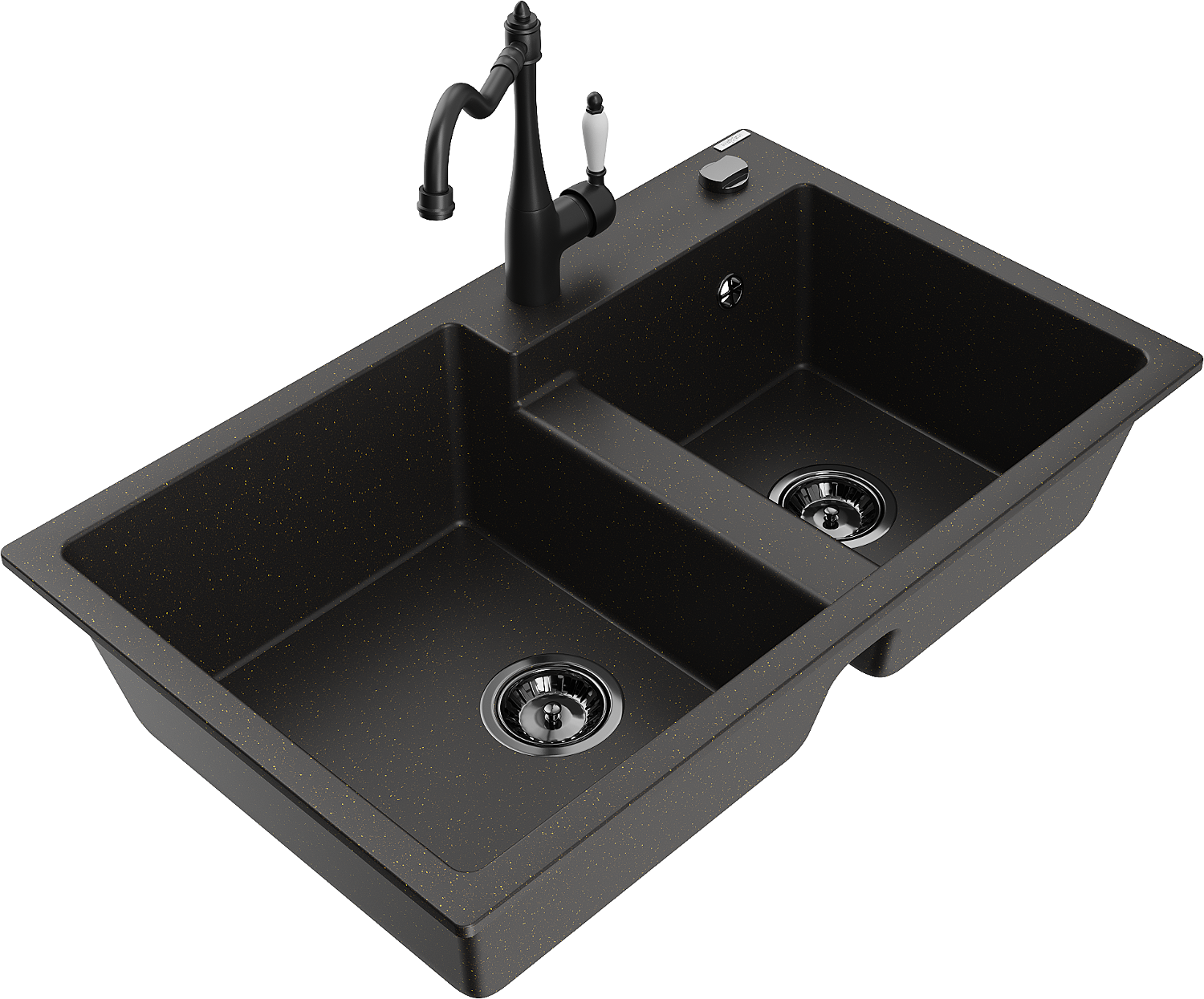 Mexen Tomas двоен гранитен кухненски мивка с батерия Carla, черен/златист металик - 6516-75-670700-70-B