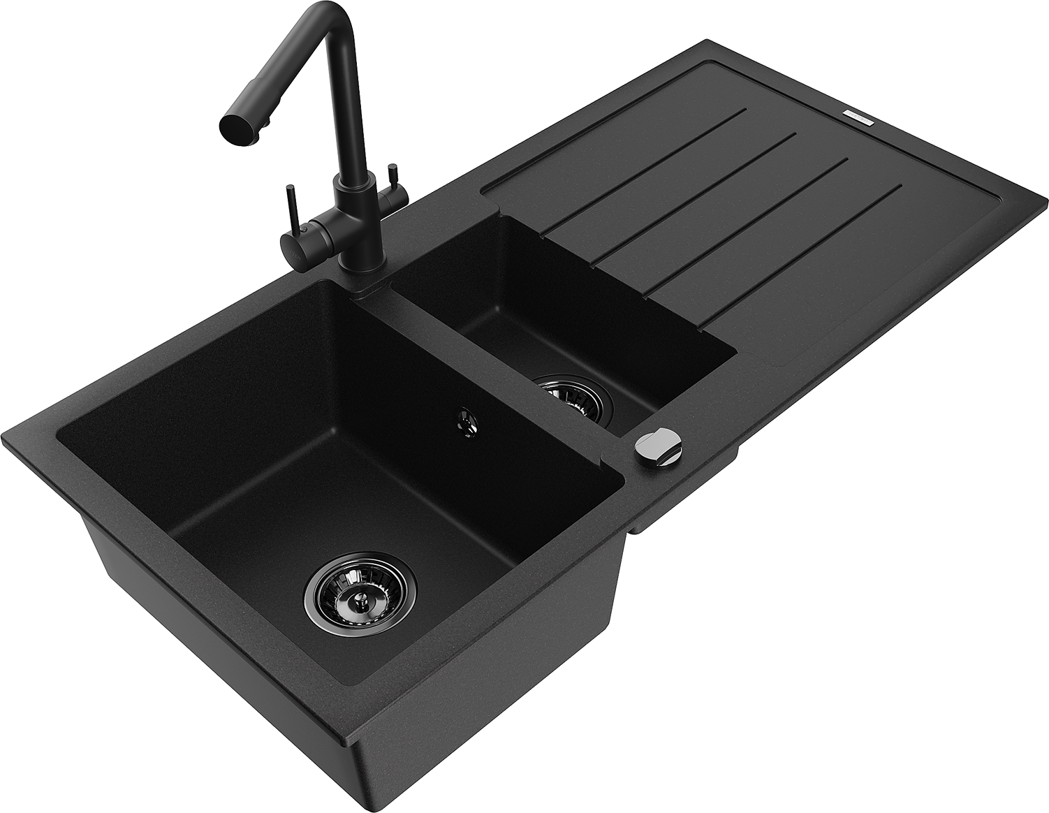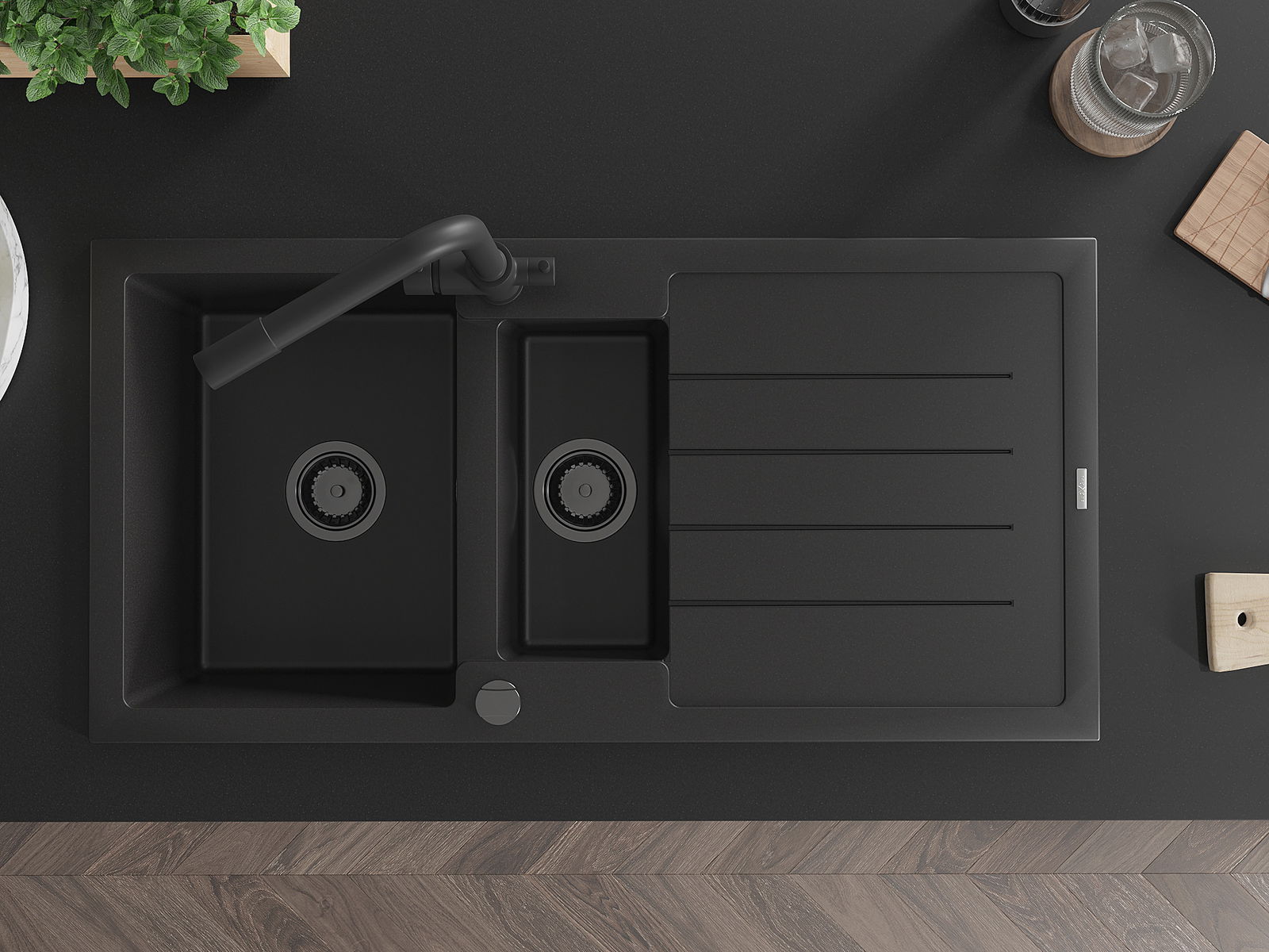 Mexen Andres Гранитна мивка 1,5-коморна с отцедник и кухненски смесител Duero, черно - 6515-77-671600-70-B