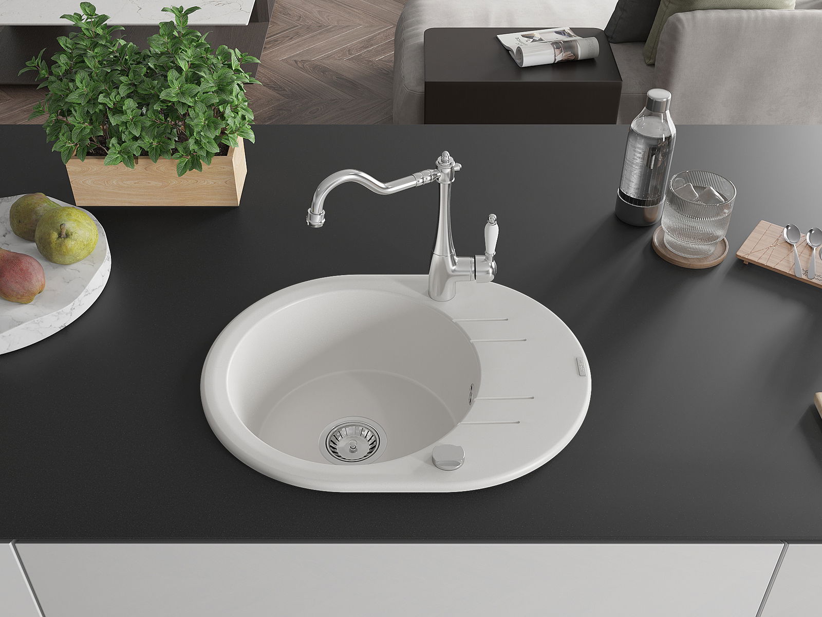 Мивката е направена от висококачествен гранит. Това е елегантно и най -вече практично допълнение към всяка кухня, независимо от нейния стил. Висококачествената и гранитна издръжливост осигуряват много години употреба.