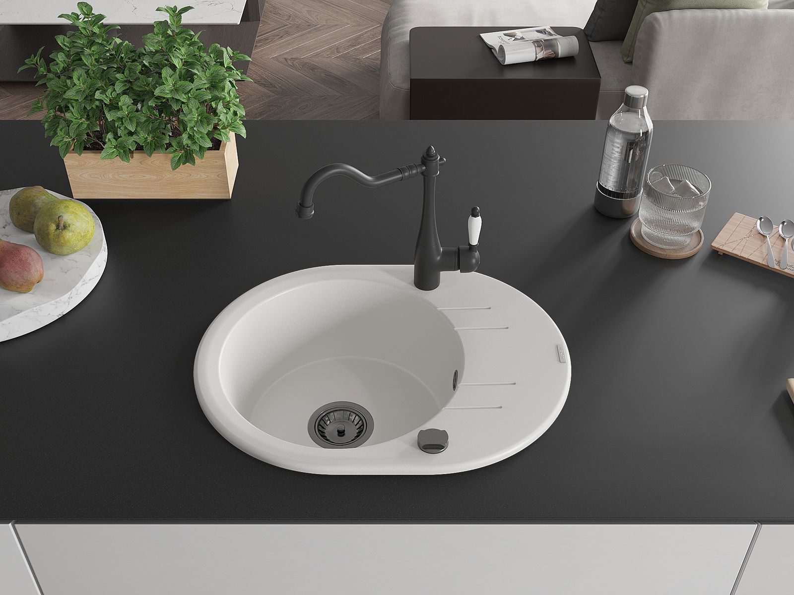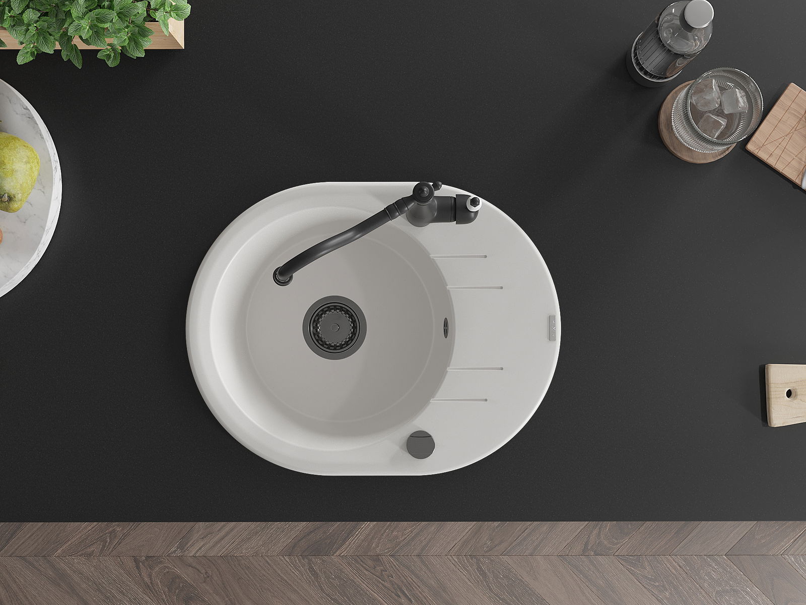 Мивката е направена от висококачествен гранит. Това е елегантно и най -вече практично допълнение към всяка кухня, независимо от нейния стил. Висококачествената и гранитна издръжливост осигуряват много години употреба.