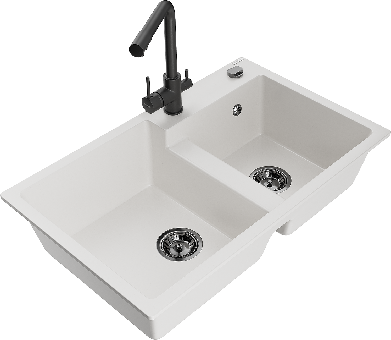 Mexen Tomas гранитна мивка с две отделения с кухненски смесител Duero, бял - 6516-20-671600-70