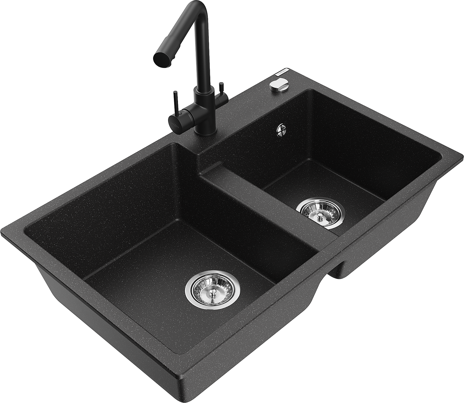 Mexen Tomas гранитна мивка с 2 отделения и кухненски смесител Duero, черен/сребрист металик - 6516-73-671600-70