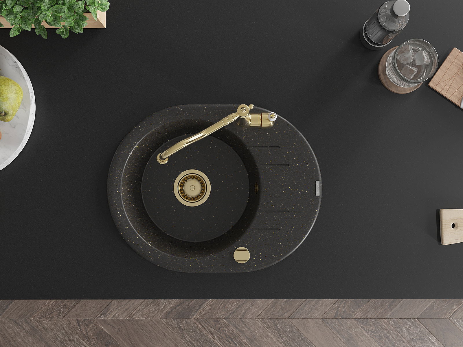 Mexen Kevin гранитна мивка с 1 отделение и отцедник и кухненски смесител Carla, черно/златен металик - 6517-75-670700-50