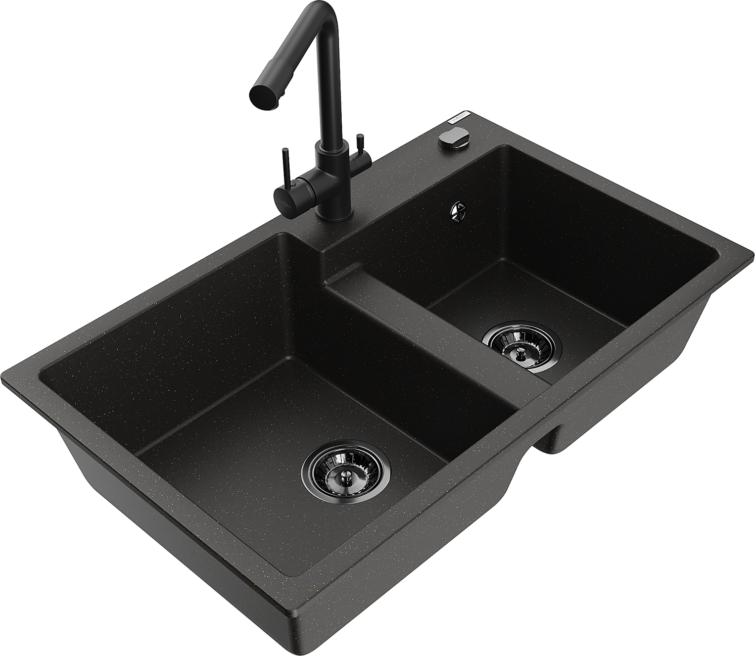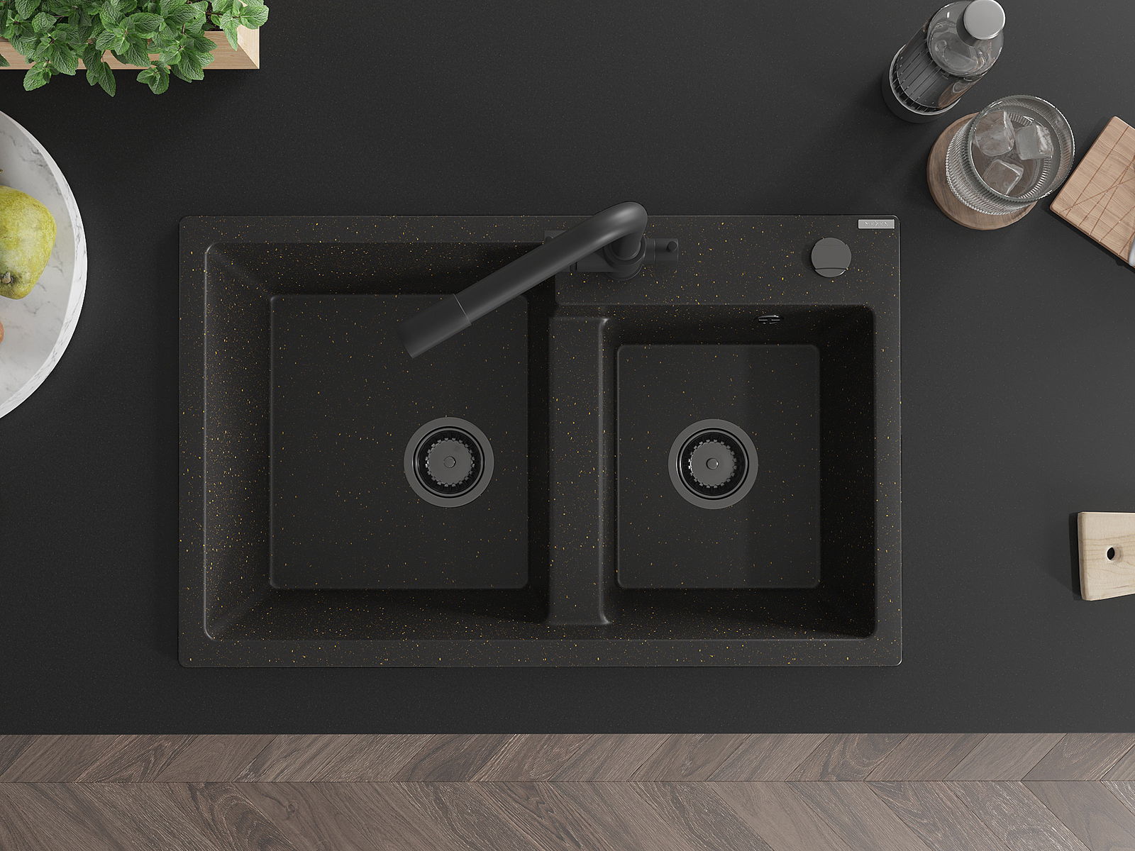 Mexen Tomas двукаморен гранитен мивка с кухненски смесител Duero, черно/златист металик - 6516-75-671600-70-B