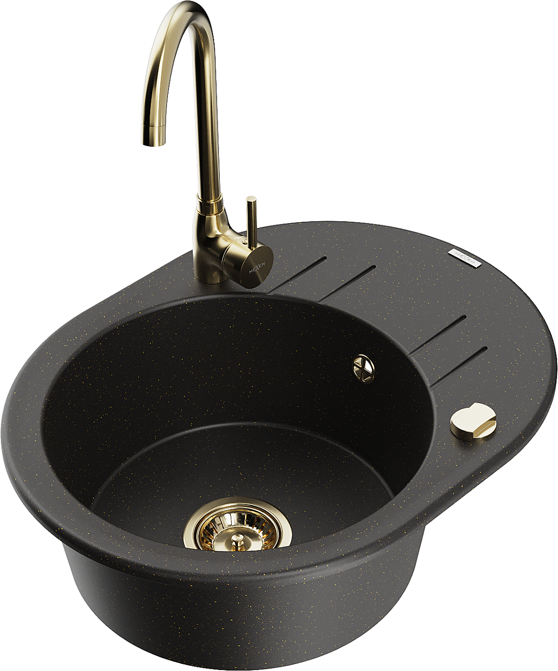 Mexen Kevin гранитна мивка с 1 купа с отцедник и кухненски смесител Telma, черен/златен металик - 6517-75-670200-50