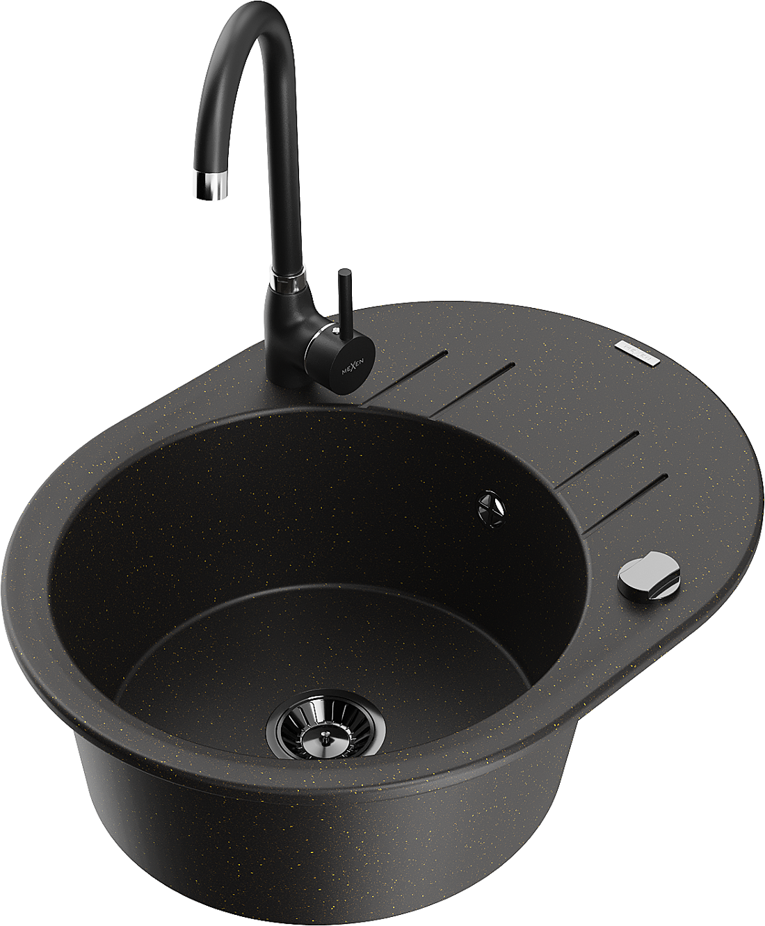Mexen Kevin гранитна мивка с 1 отделение и отцедник с кухненски смесител Telma, черно/златен металик - 6517-75-670200-70-B