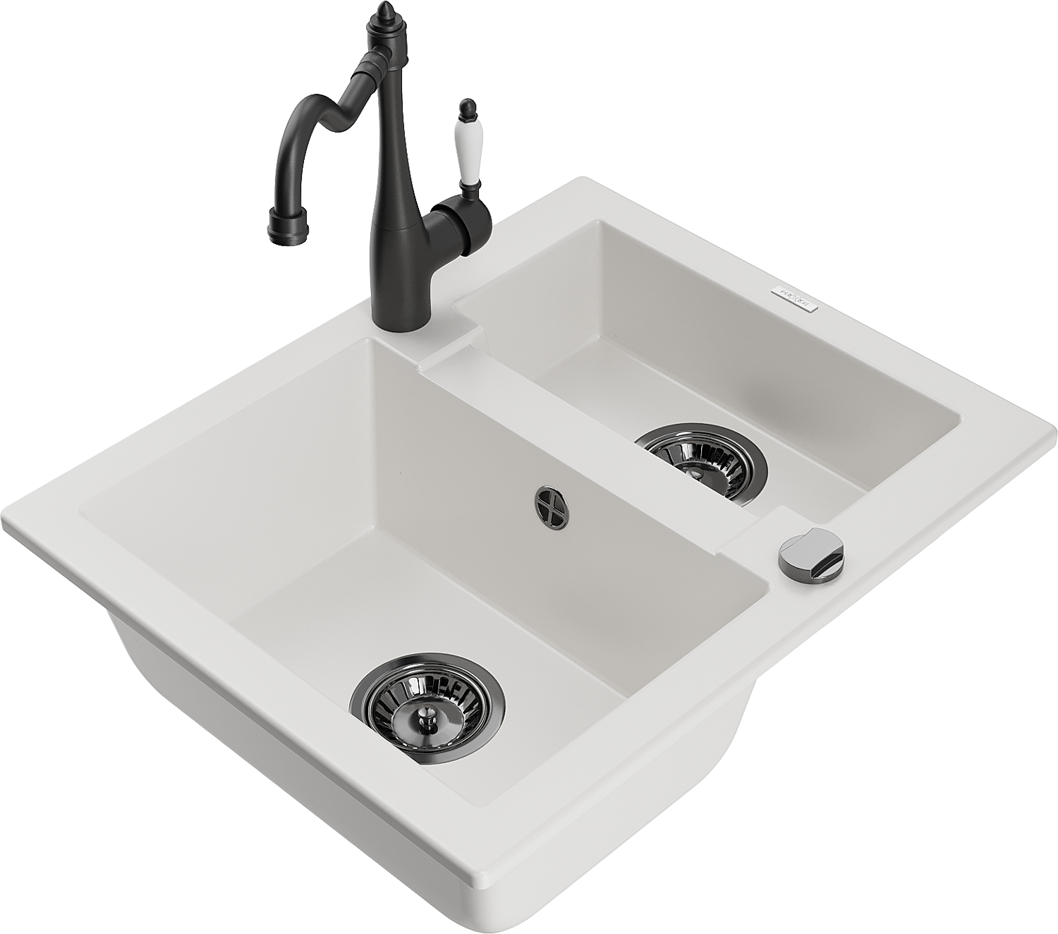 Mexen Carlos гранитна мивка 1,5-камерна с кухненски смесител Carla, бял - 6518-20-670700-70
