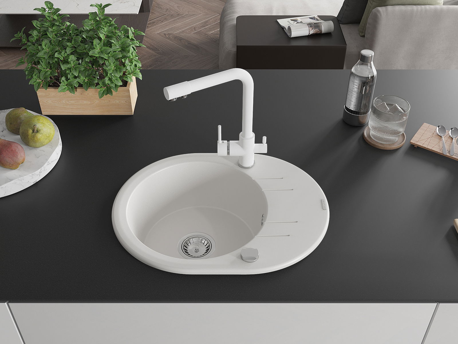 Мивката е направена от висококачествен гранит. Това е елегантно и най -вече практично допълнение към всяка кухня, независимо от нейния стил. Висококачествената и гранитна издръжливост осигуряват много години употреба.