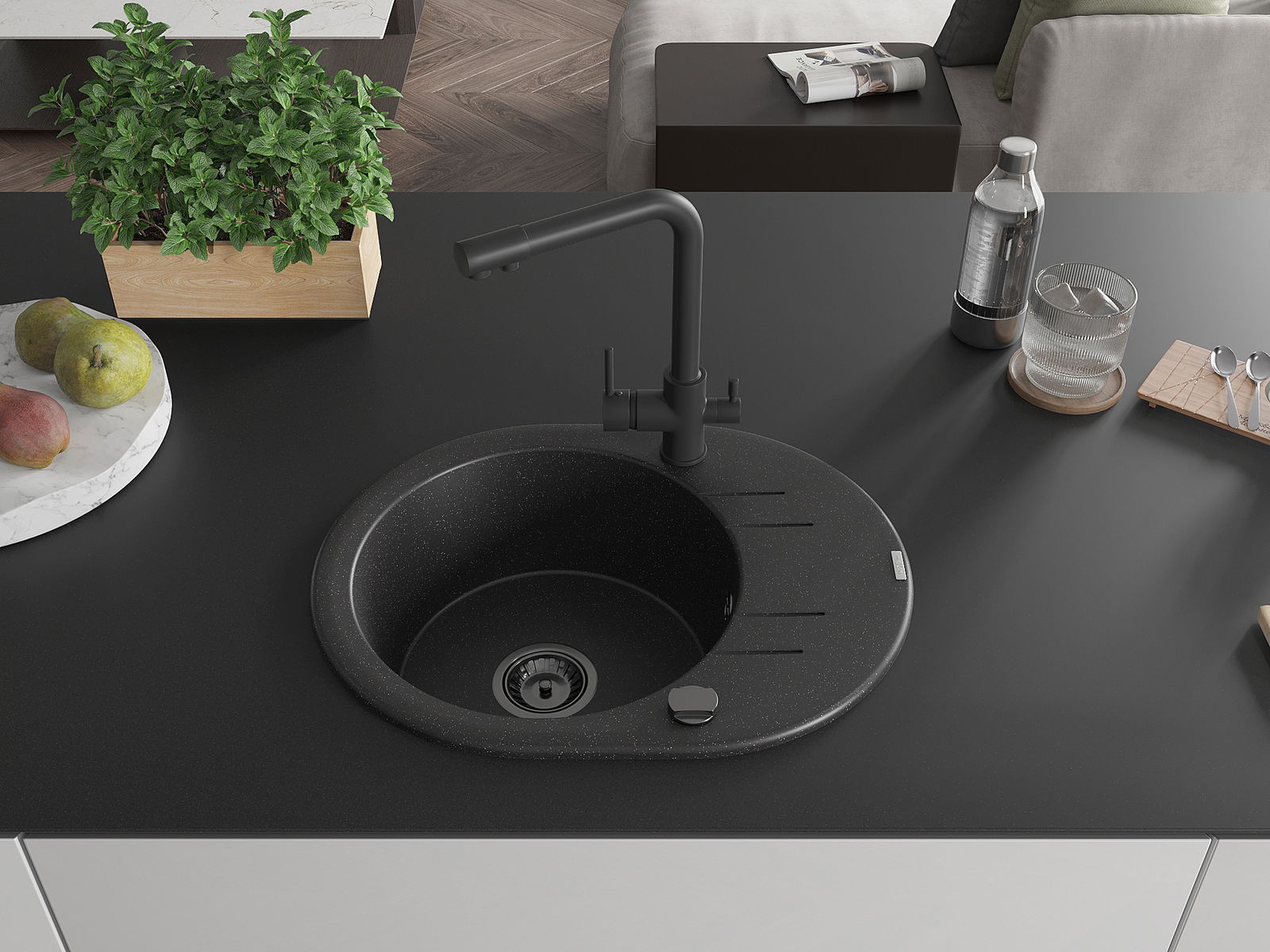 Мивката е направена от висококачествен гранит. Това е елегантно и най -вече практично допълнение към всяка кухня, независимо от нейния стил. Висококачествената и гранитна издръжливост осигуряват много години употреба.