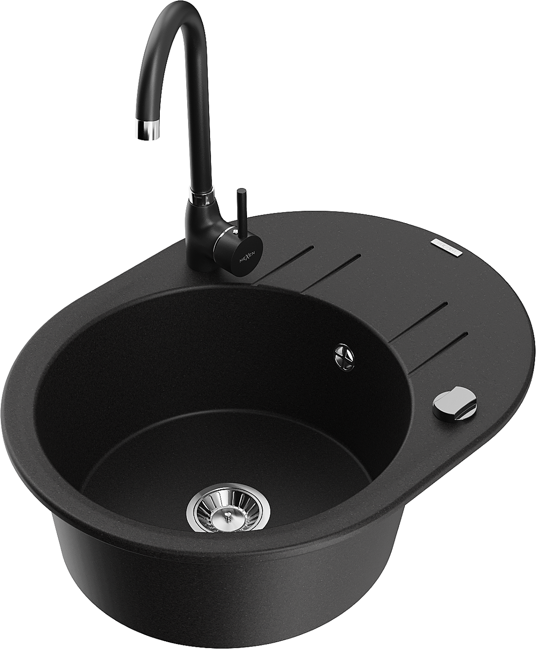 Гранитна мивка с една камера Mexen Kevin с отцедник и кухненски смесител Telma, черен - 6517-77-670200-70
