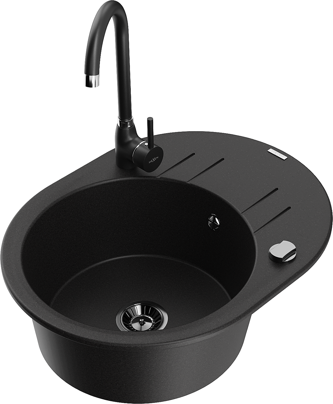 Mexen Kevin гранитна мивка с една камера с дренаж и кухненски смесител Telma, черен - 6517-77-670200-70-B