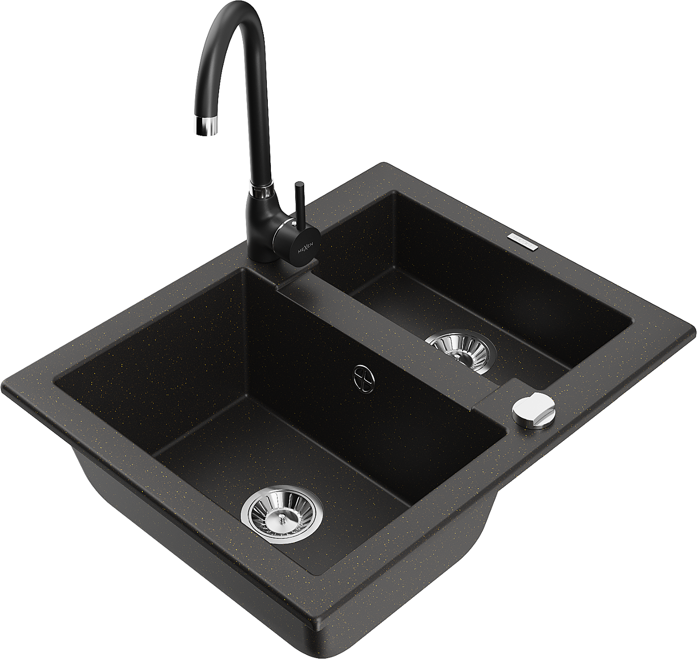 Mexen Carlos гранитна мивка с 1,5 камери и кухненски смесител Telma, черен/златен металик - 6518-75-670200-70