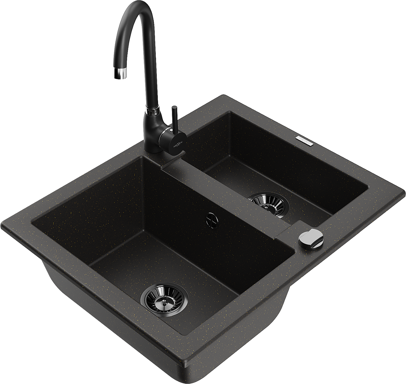 Мивка Mexen Carlos гранитна 1,5-коморова с кухненски смесител Telma, черен/златен металик - 6518-75-670200-70-B