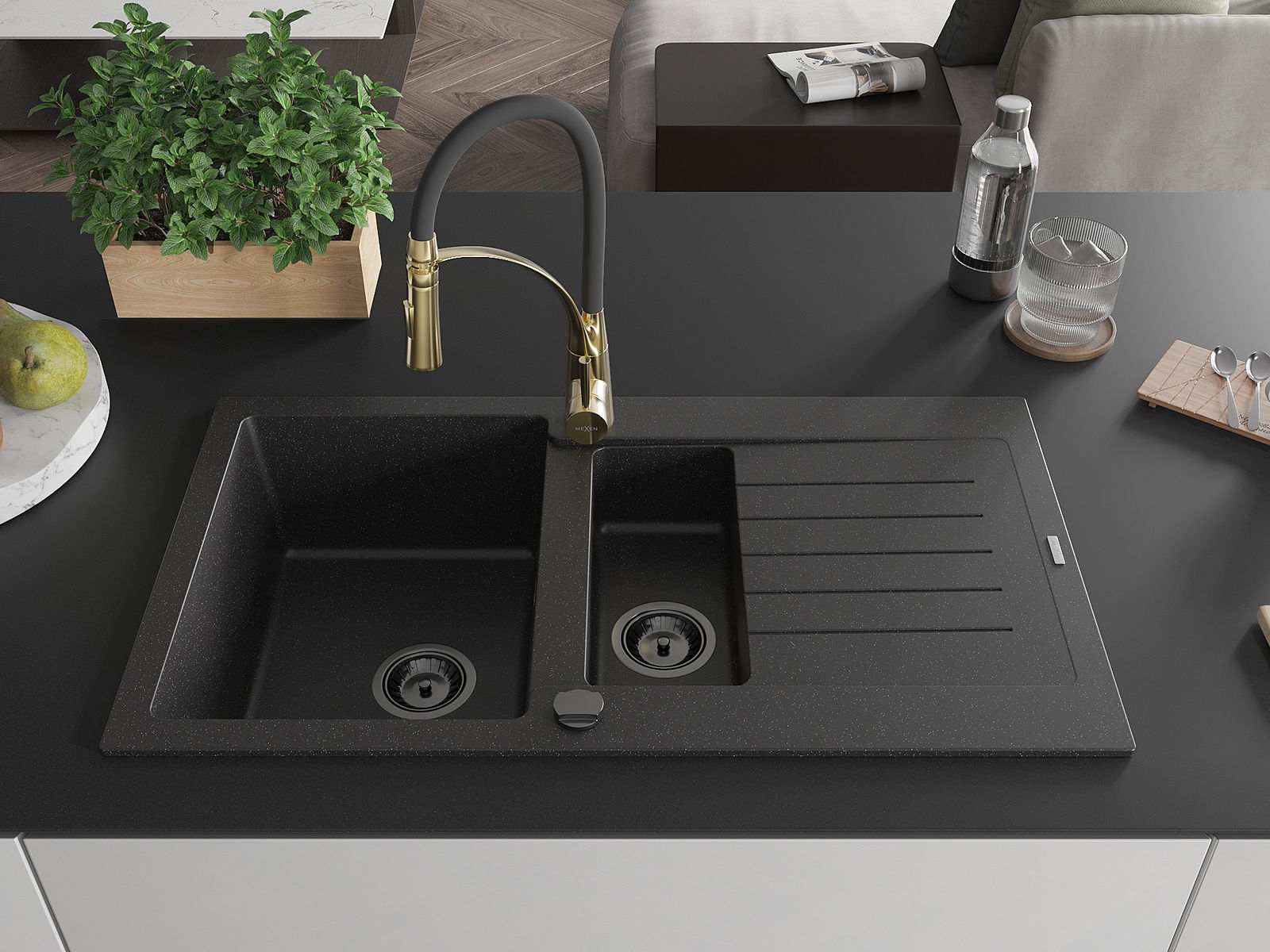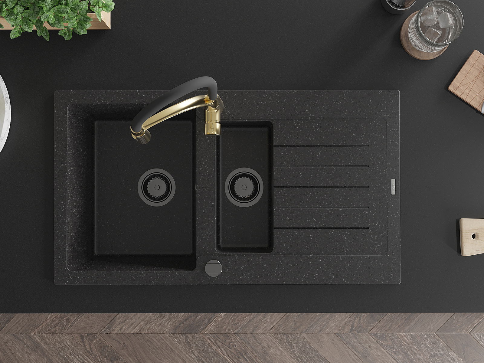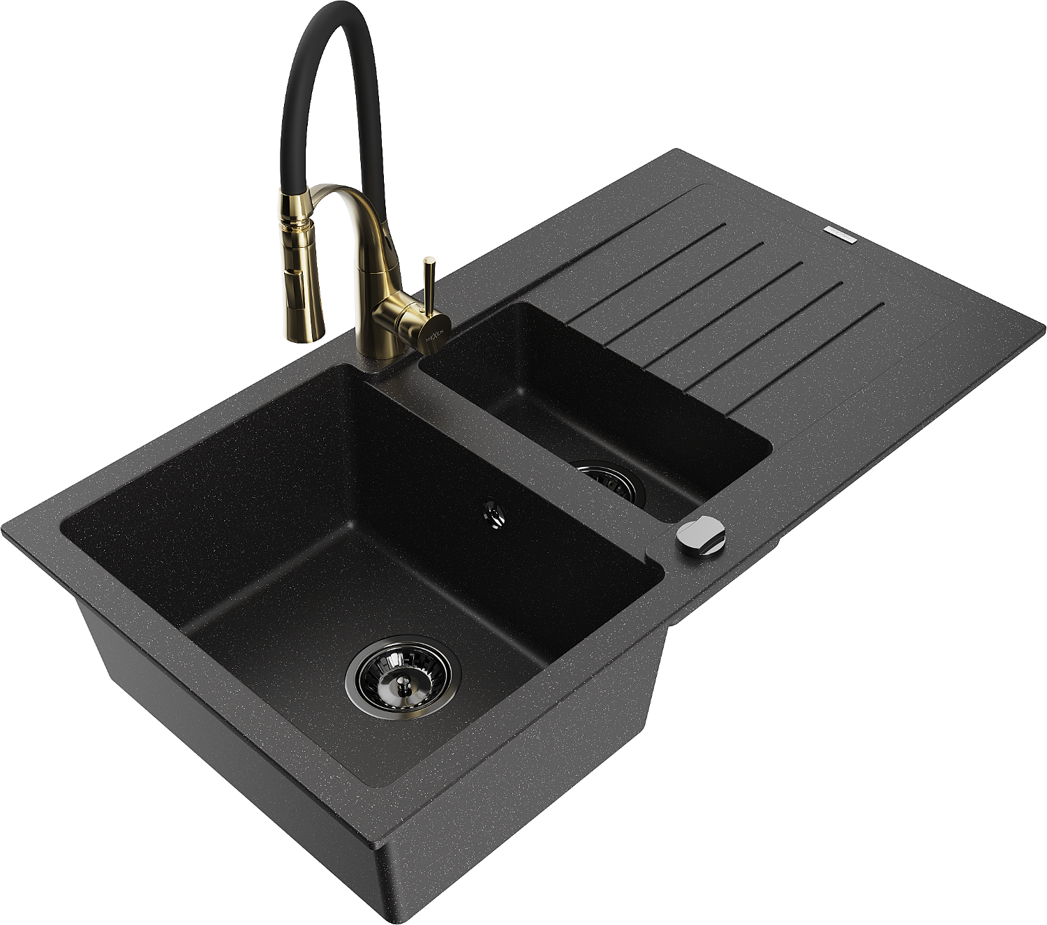 Mexen Matias гранитна мивка с 1,5 камери с отцеждане и кухненски смесител Aster, черен/сребрист - 6502-73-73450-57-B