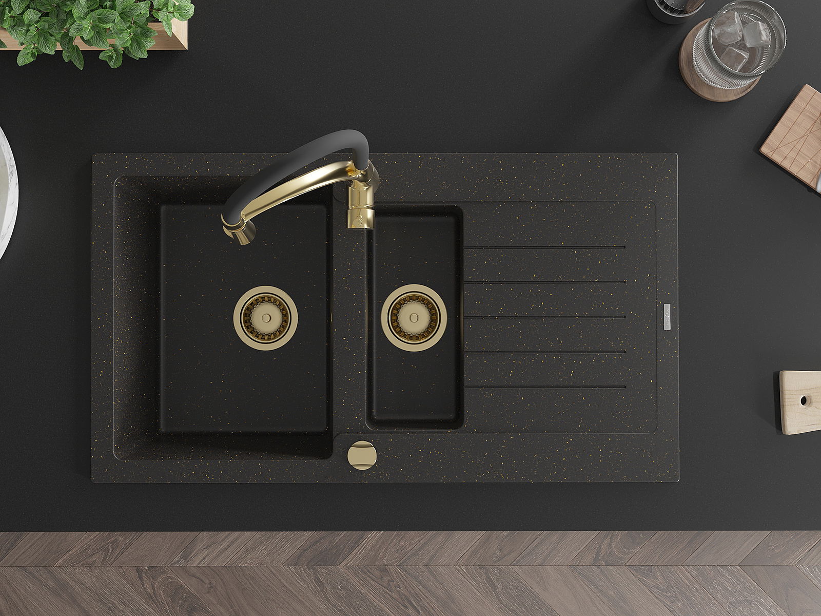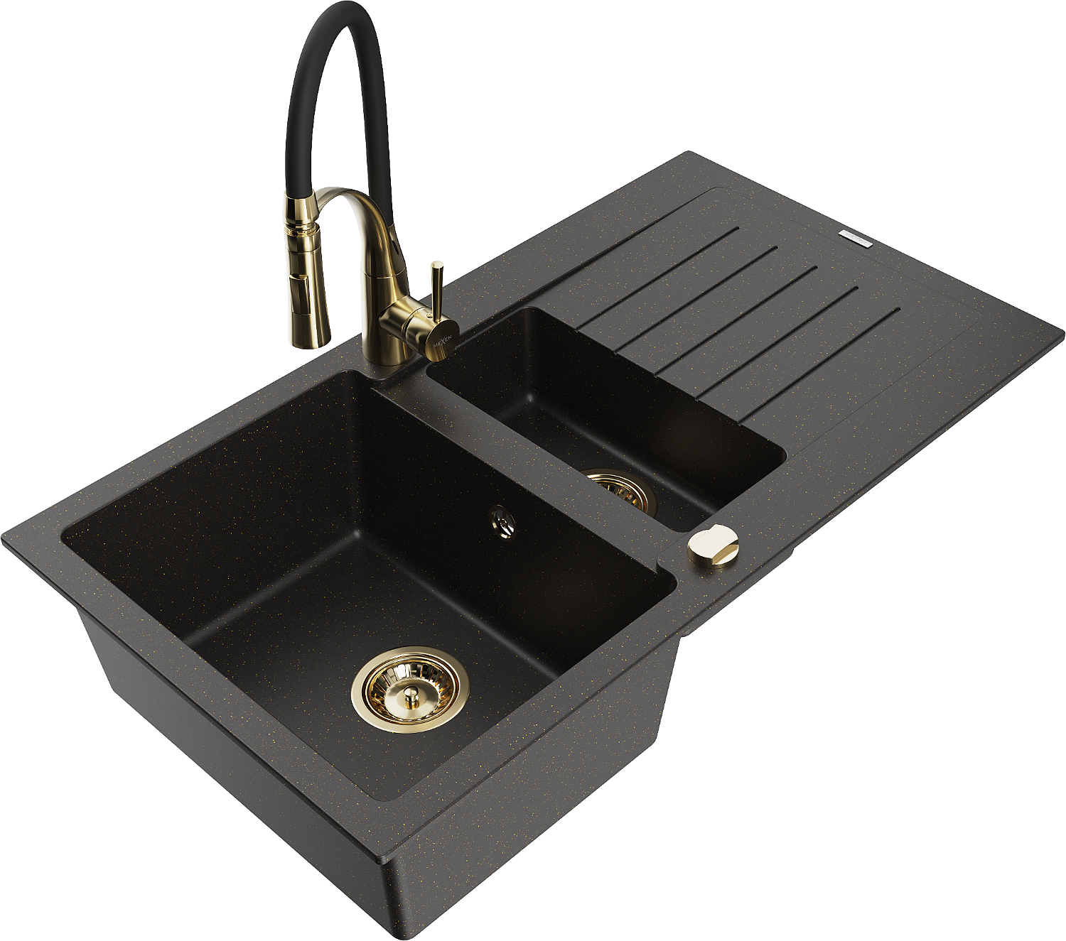 Мивка от гранит Mexen Matias с 1,5 камери и окапник и кухненски смесител Aster, черен/златен металик - 6502-75-73450-57-G