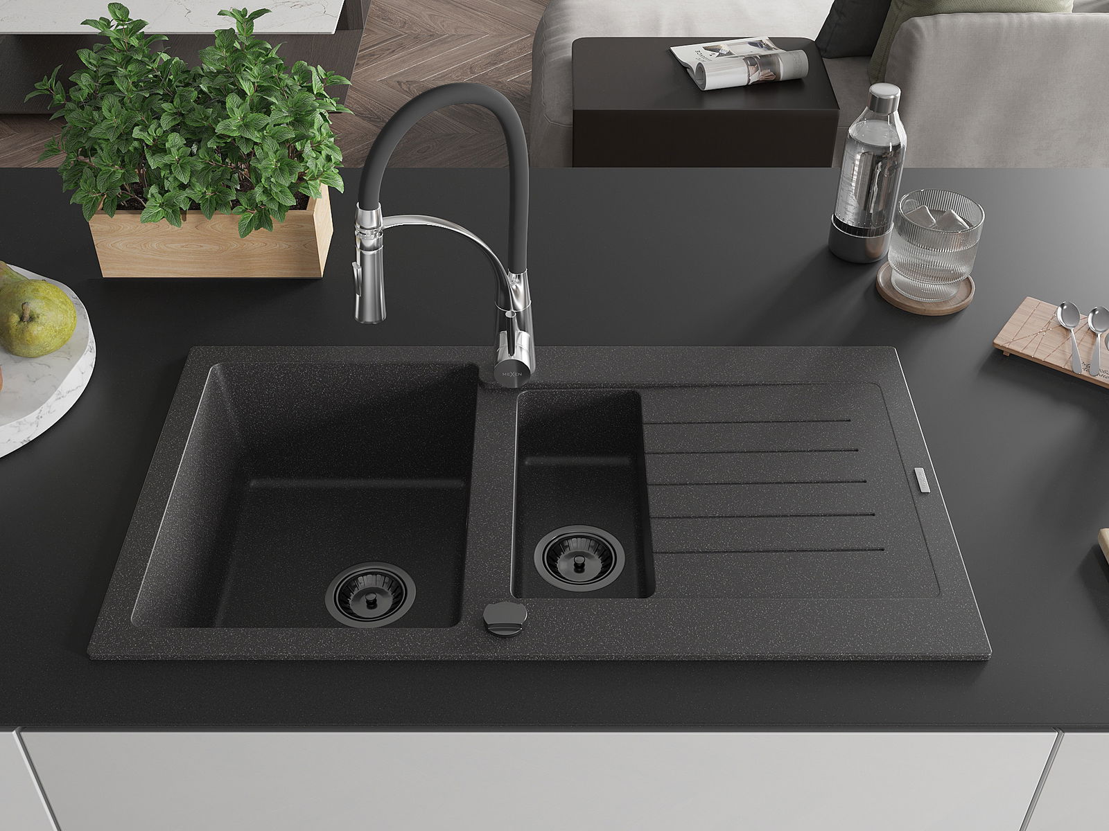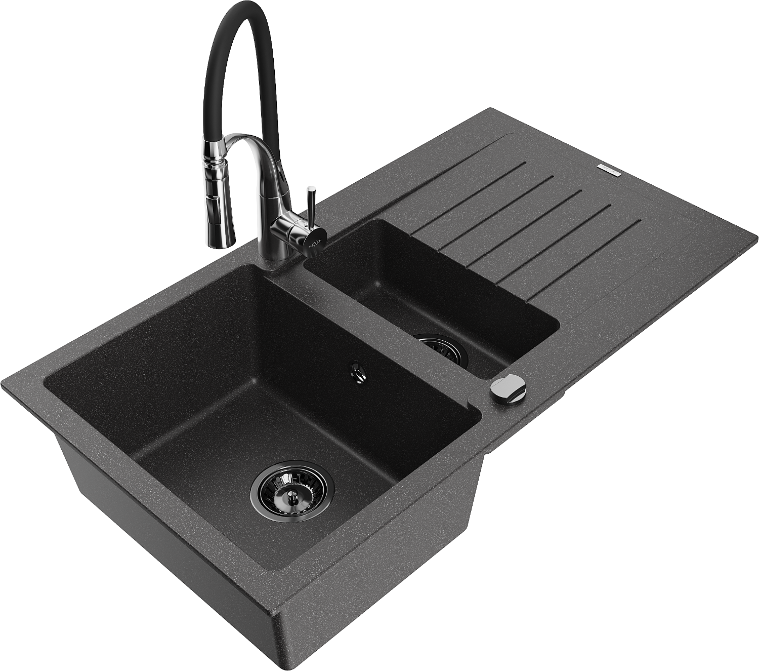 Mexen Matias гранитна мивка 1,5-коморна с плочи и кухненски смесител Aster, черен на пръски - 6502-76-73450-07-B
