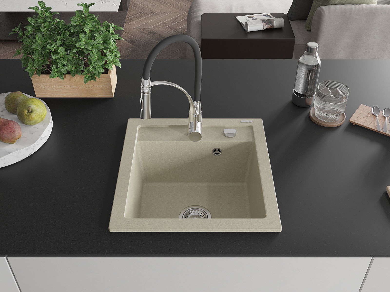 Мивката е направена от висококачествен гранит. Това е елегантно и най -вече практично допълнение към всяка кухня, независимо от нейния стил. Висококачествената и гранитна издръжливост осигуряват много години употреба.