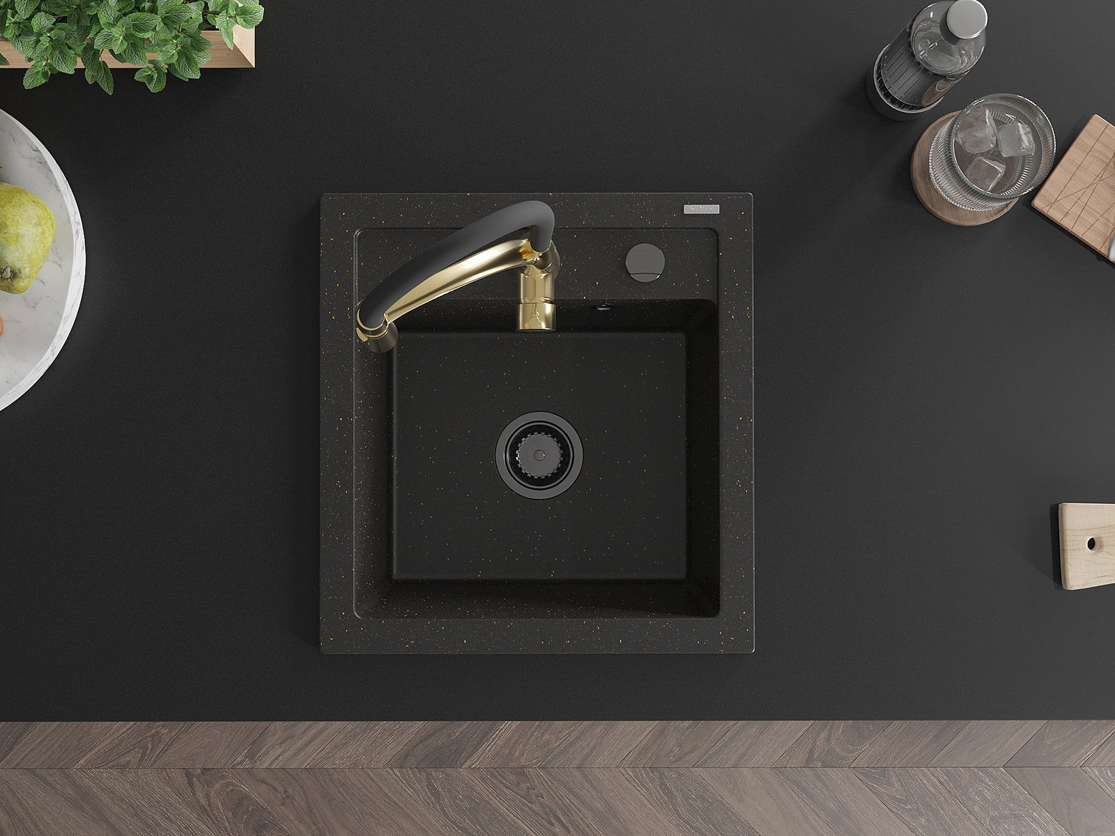 Mexen Vito гранитна кухненска мивка с 1 отделение с хоризонтален смесител Aster, черен/златен металик- 6503-75-73450-57-B