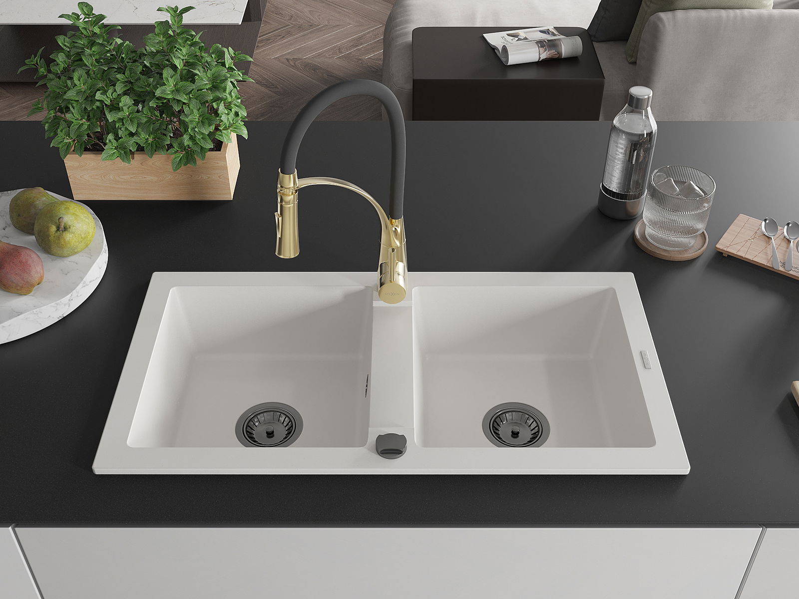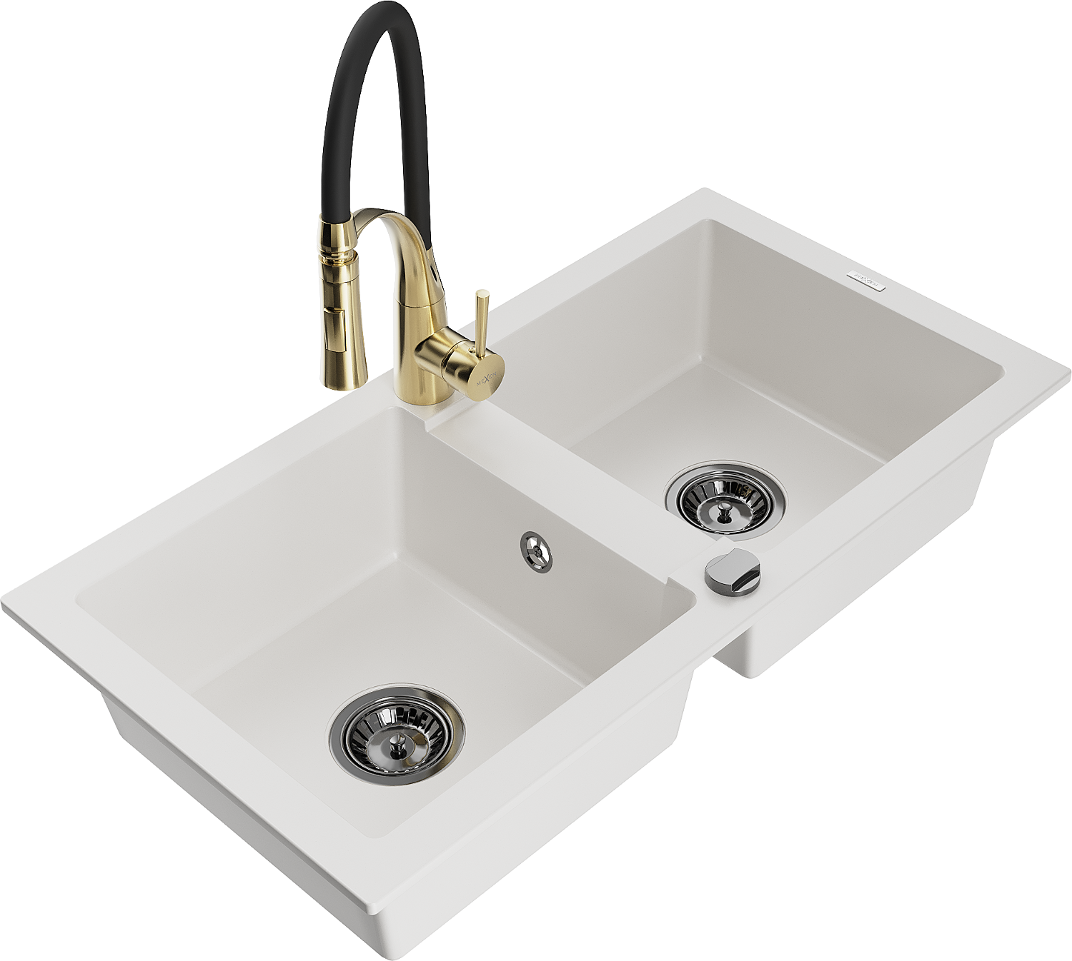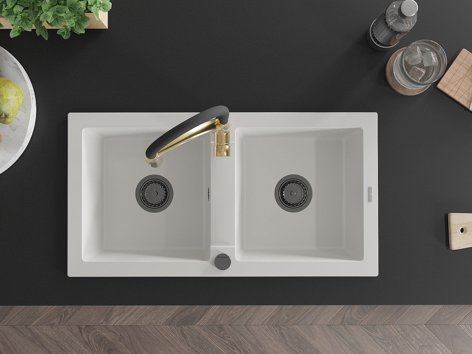 Mexen Mario гранитна мивка с 2 отделения и кухненски смесител Aster, бял - 6504-20-73450-57-B