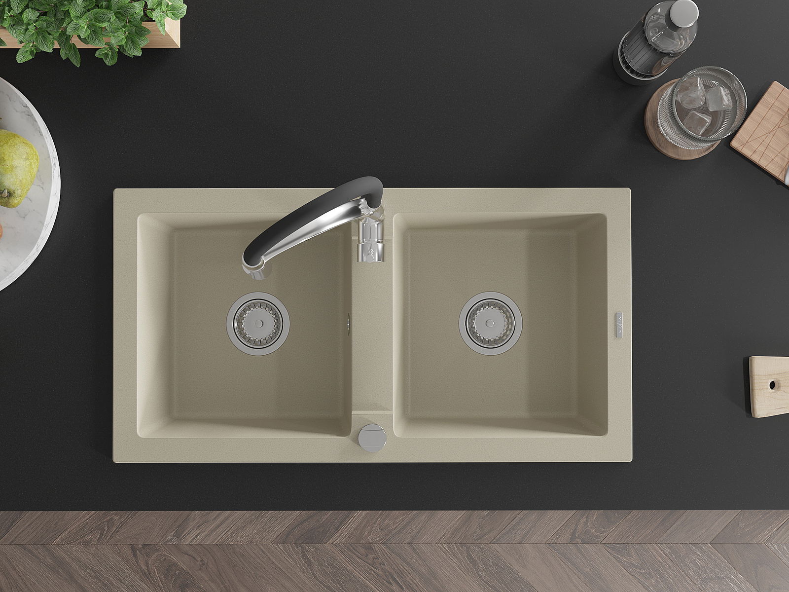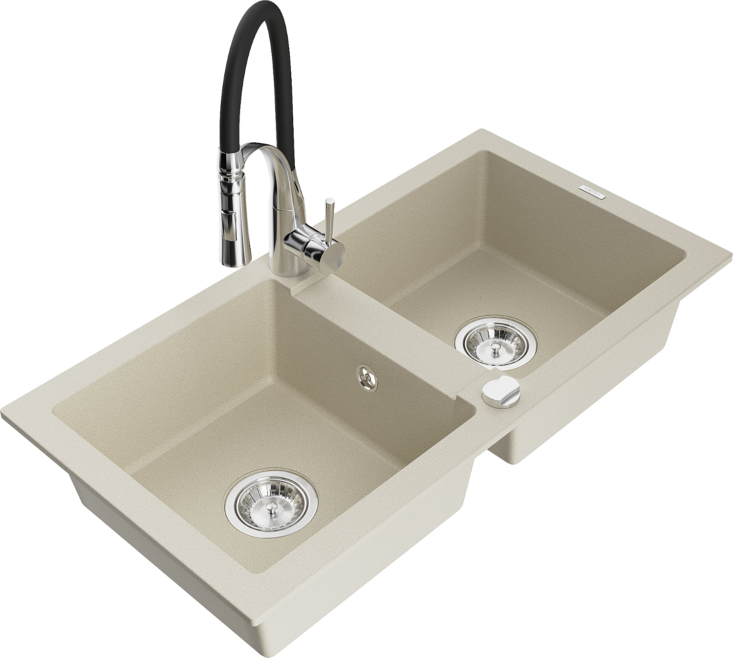 Mexen Mario гранитна мивка с 2 камери и кухненски смесител Aster, бежов - 6504-69-73450-07