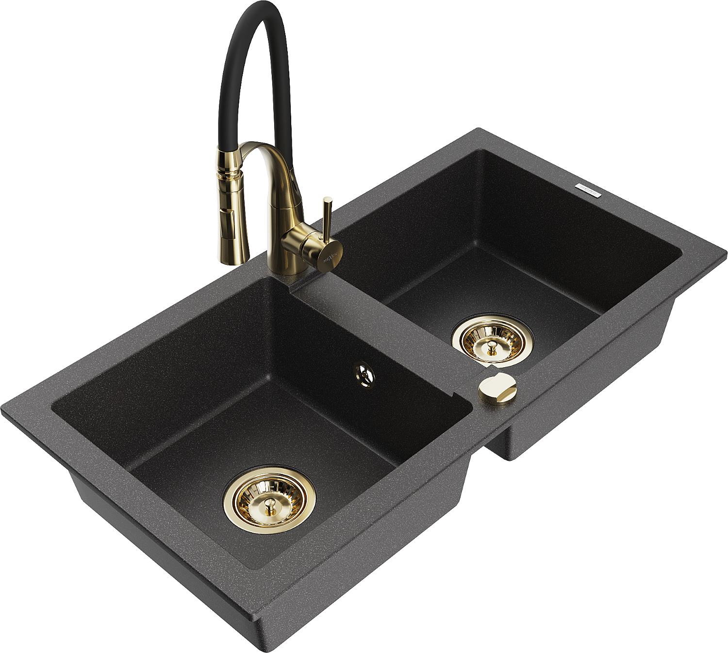 Mexen Mario мивка от гранит с 2 камери с кухненски смесител Aster, черен на пръски - 6504-76-73450-57-G