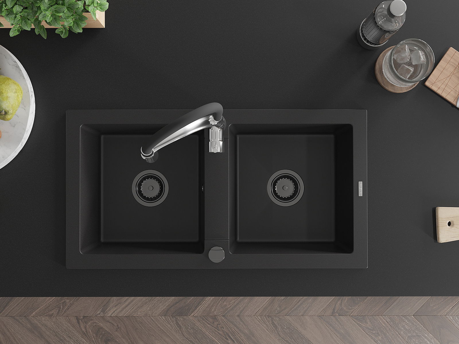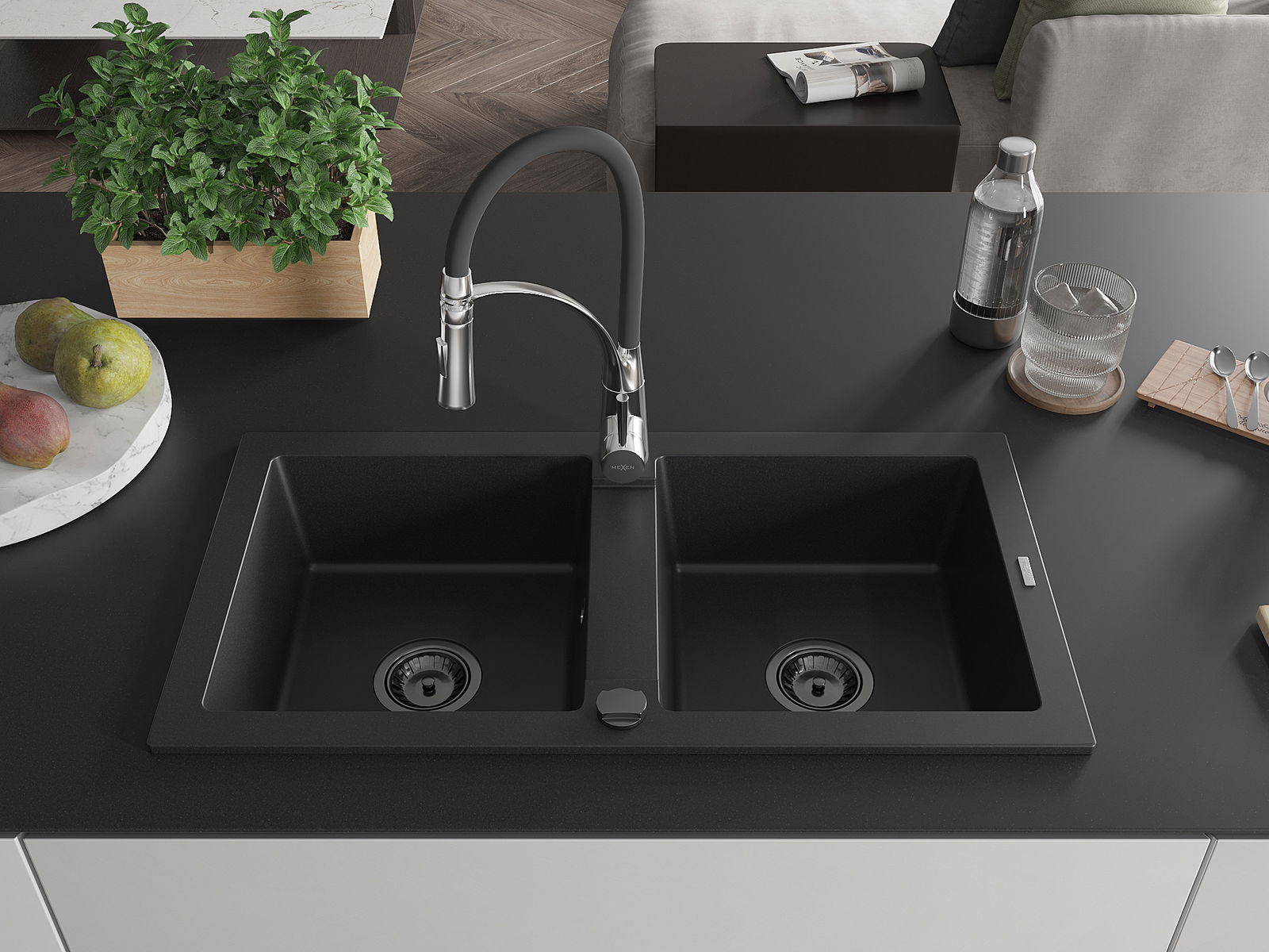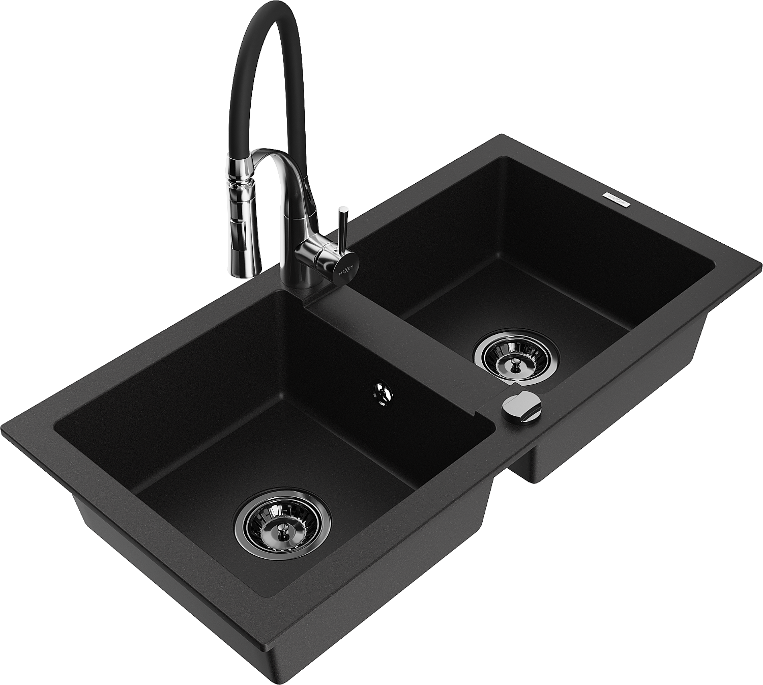 Mexen Mario гранитна мивка с 2 отделения и кухненски смесител Aster, черен - 6504-77-73450-07-B