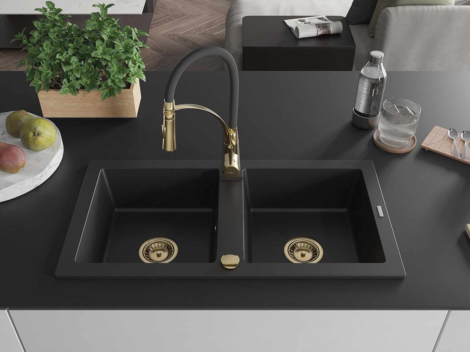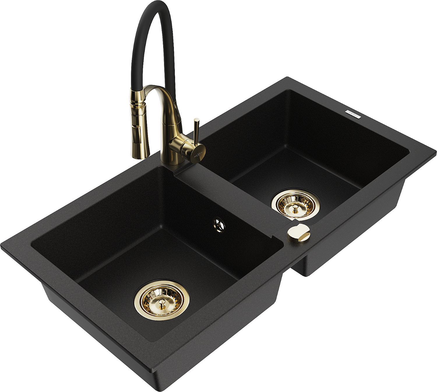 Mexen Mario гранитна мивка с 2 отделения с кухненски смесител Aster, черен - 6504-77-73450-57-G