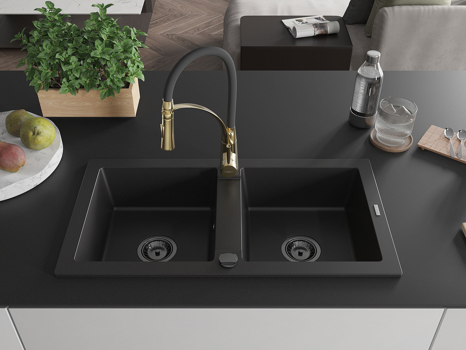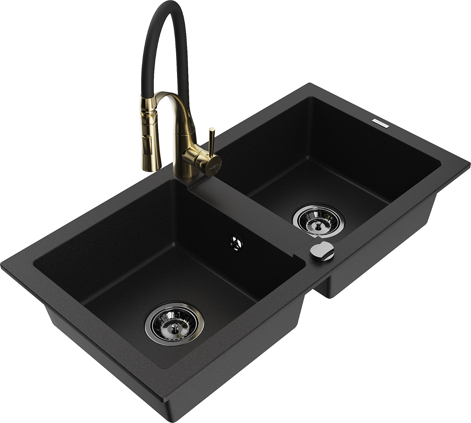 Mexen Mario кухненска мивка от гранит с 2 камери и кухненски смесител Aster, черен - 6504-77-73450-57-B