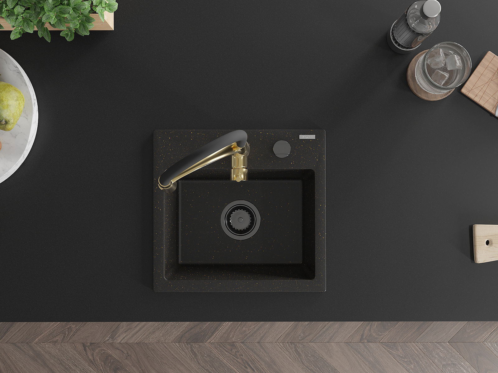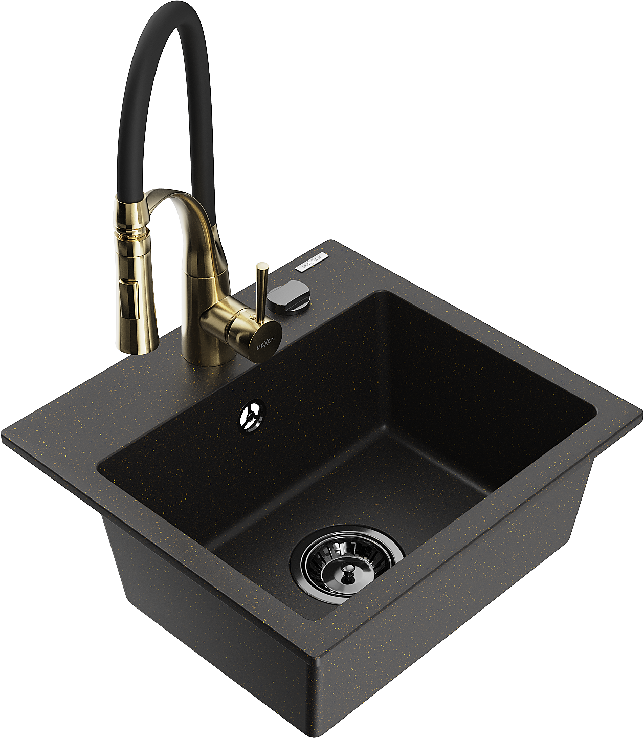 Mexen Milo гранитна мивка с 1 камера и кухненски смесител Aster, черно/златисто металик - 6505-75-73450-57-B