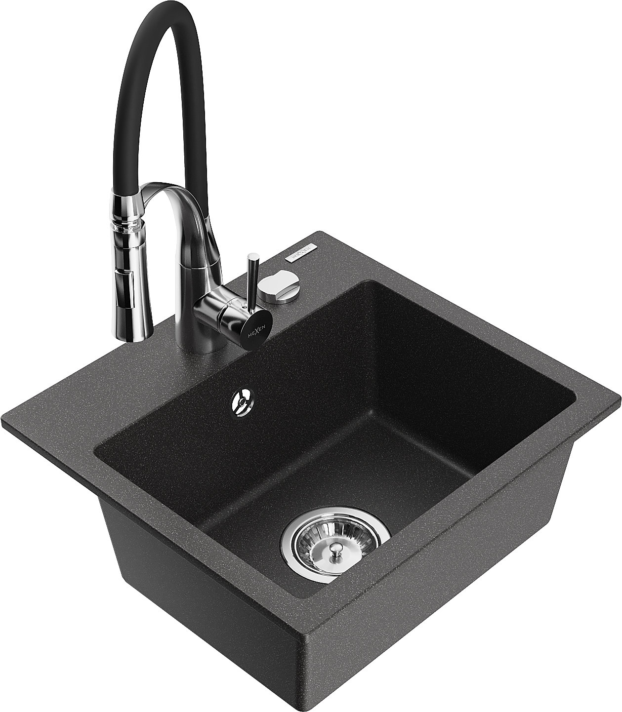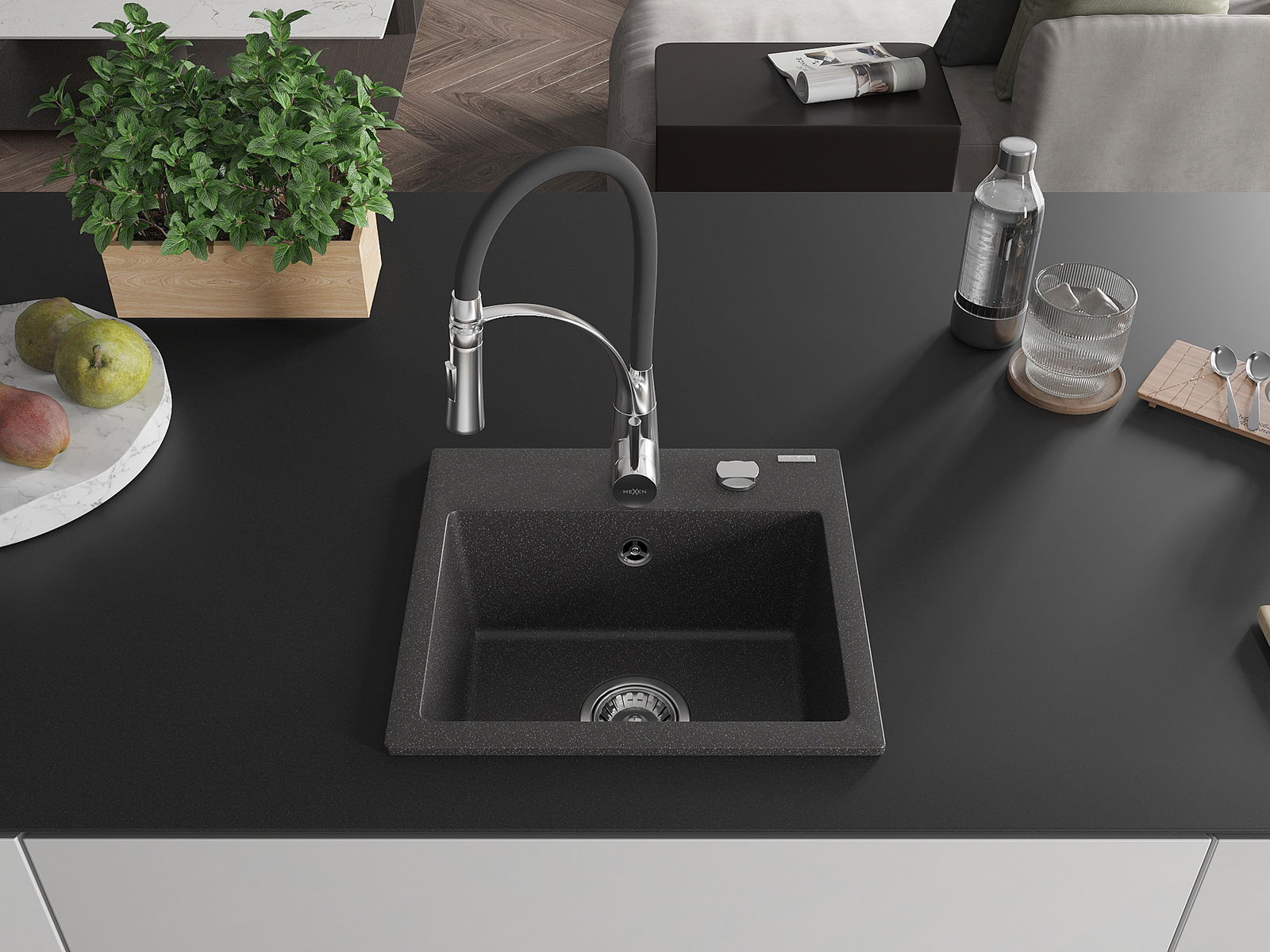 Mexen Milo гранитна кухненска мивка с 1 отделение с кухненски смесител Aster, черно с пръски - 6505-76-73450-07