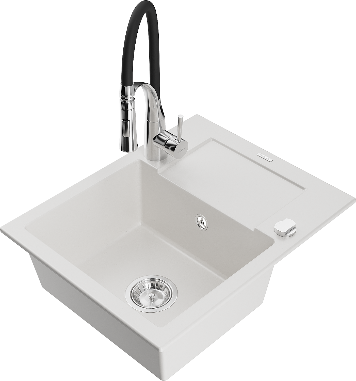 Mexen Enzo гранитна мивка с 1 отделение и отцедник и кухненски смесител Aster, бял - 6506-20-73450-07