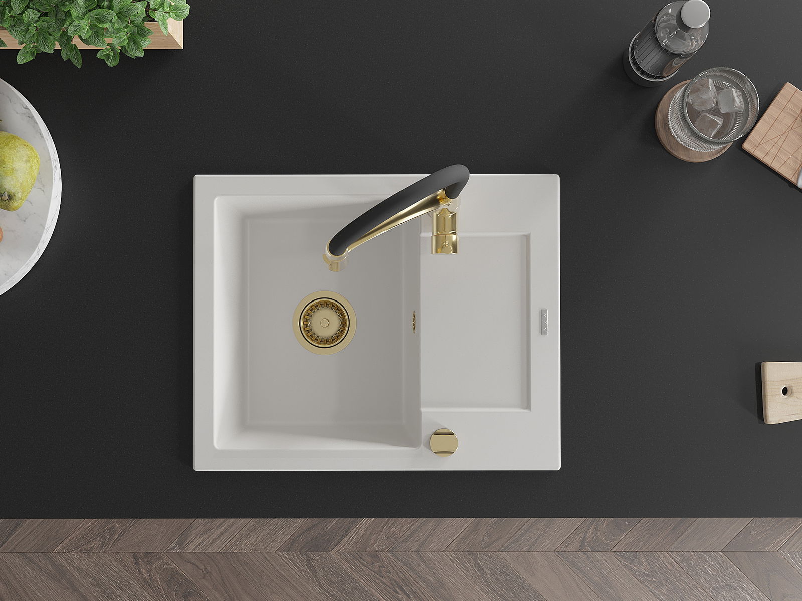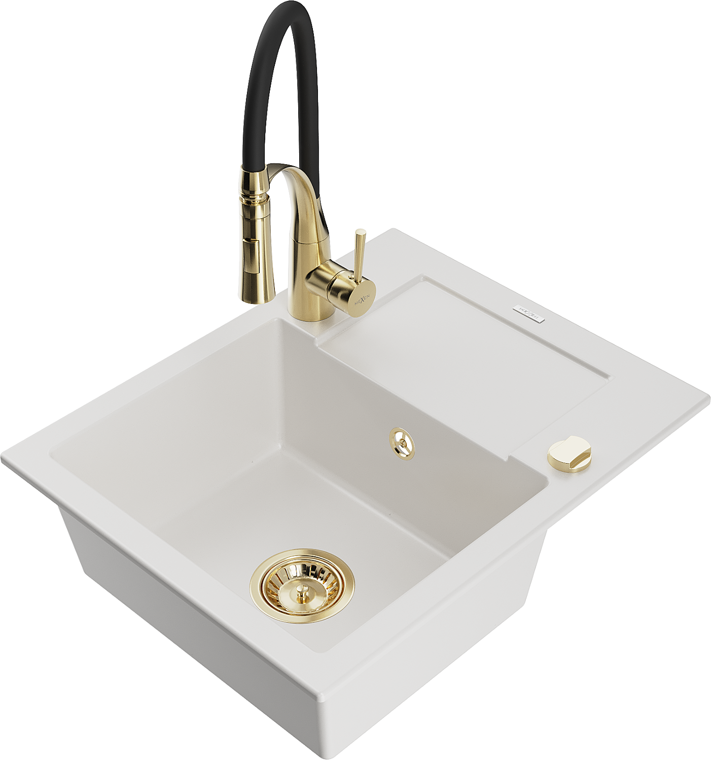 Mexen Enzo гранитна мивка с една камера с отцедник и кухненски смесител Aster, бял - 6506-20-73450-57-G