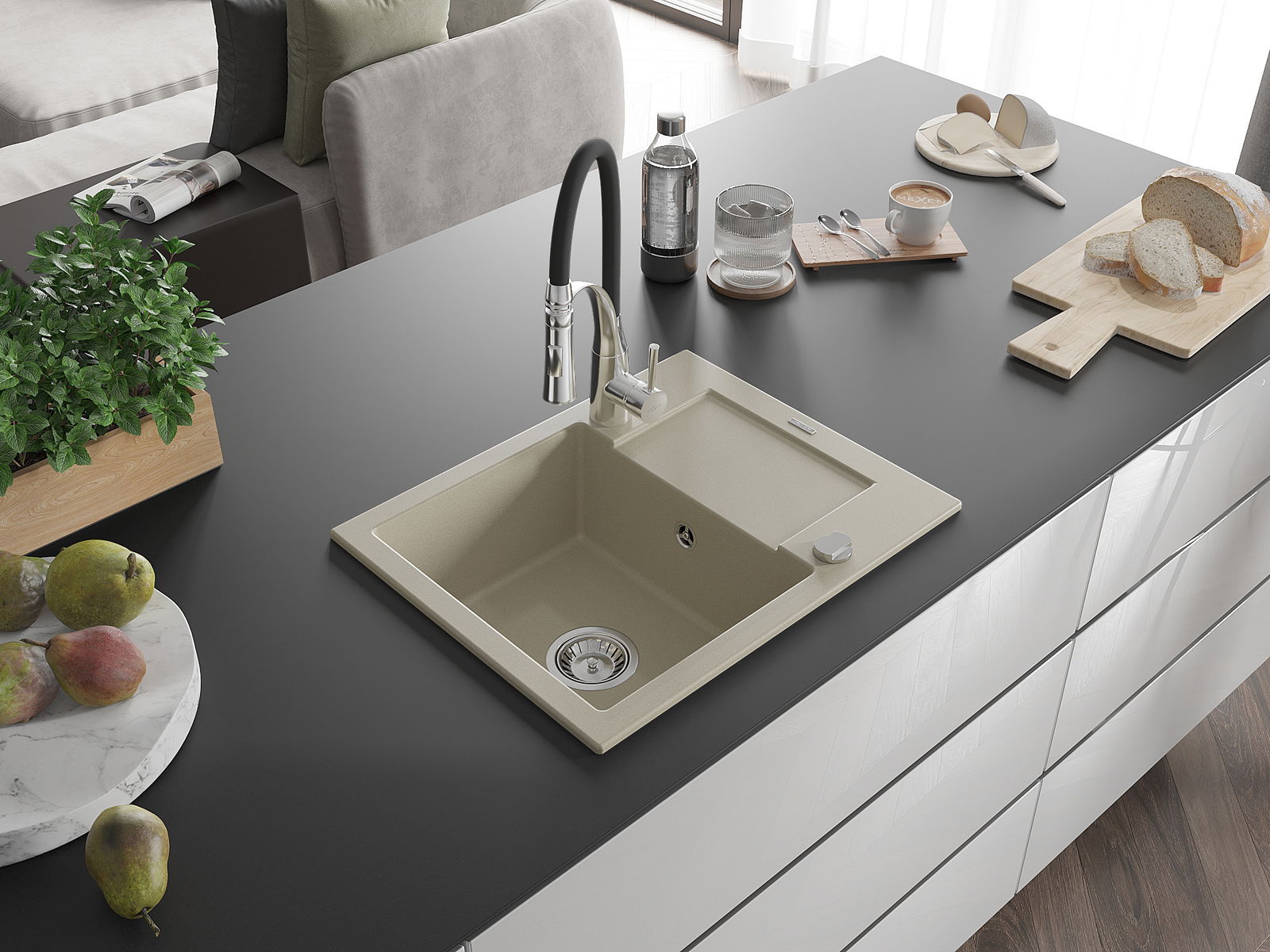 Мивката е направена от висококачествен гранит. Това е елегантно и най -вече практично допълнение към всяка кухня, независимо от нейния стил. Висококачествената и гранитна издръжливост осигуряват много години употреба.