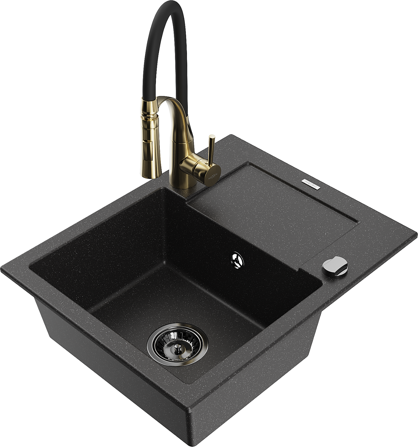 Гранитна кухненска мивка Mexen Enzo 1-коморна с отцедник и кухненски смесител Aster, черен/сребърен металик - 6506-73-73450-57-?
